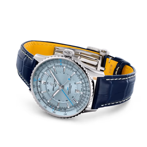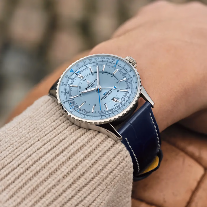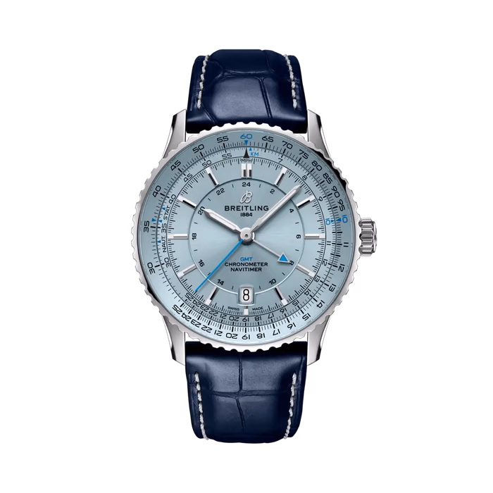 The Breitling Navitimer GMT A32310171C1P1 debuted in 2024. This Navitimer has a Stainless Steel case of 41.00mm, and an 'Ice' blue dial. This watch is powered by Caliber 32, a self-winding movement with additional 24-hour hand and date function.
