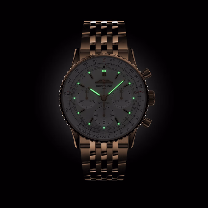 The Breitling Navitimer reference RB0139211G1R1 is part of Breitling's 2022 refresh of the iconic slide rule chronograph. This version has a Red Gold case of 41.00mm, which houses the brand's in-house caliber B01. The dial, with AOPA-inspired wing logo, is Silver.