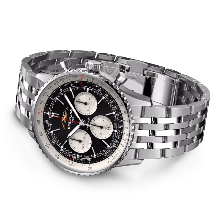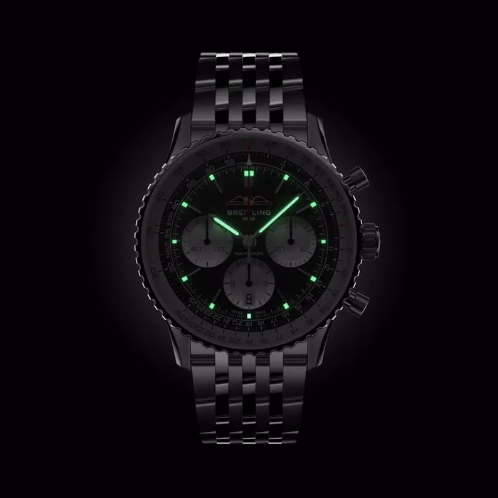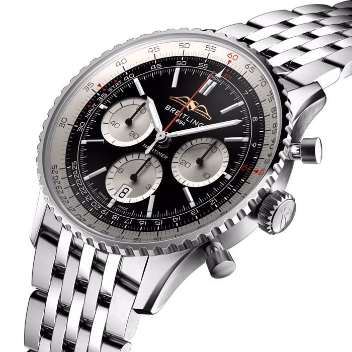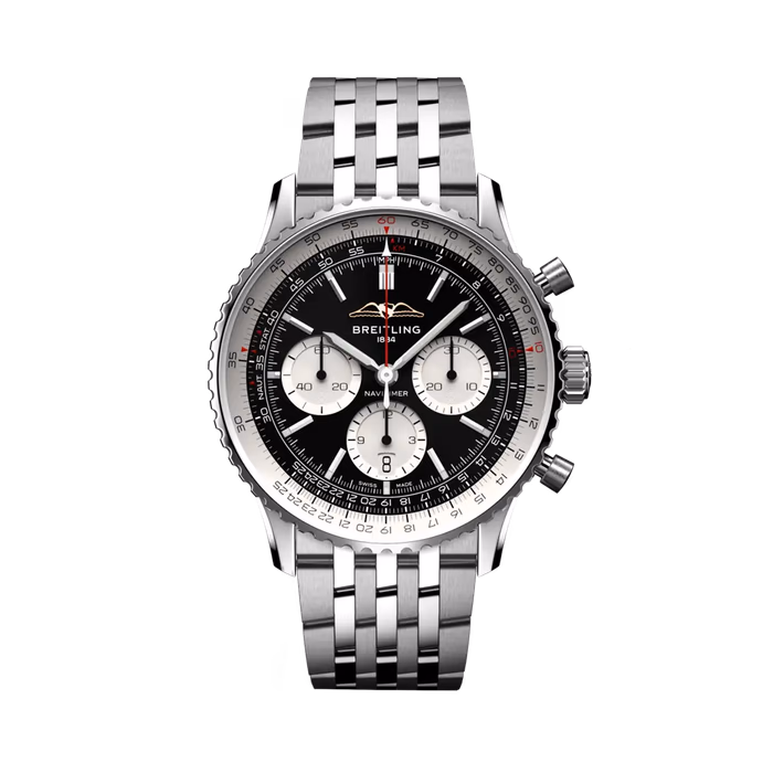 The Breitling Navitimer reference AB0138211B1A1 is part of Breitling's 2022 refresh of the iconic slide rule chronograph. This version has a Stainless Steel case of 43.00mm, which houses the brand's in-house caliber Caliber B01. The dial, with AOPA-inspired wing logo, is Black.