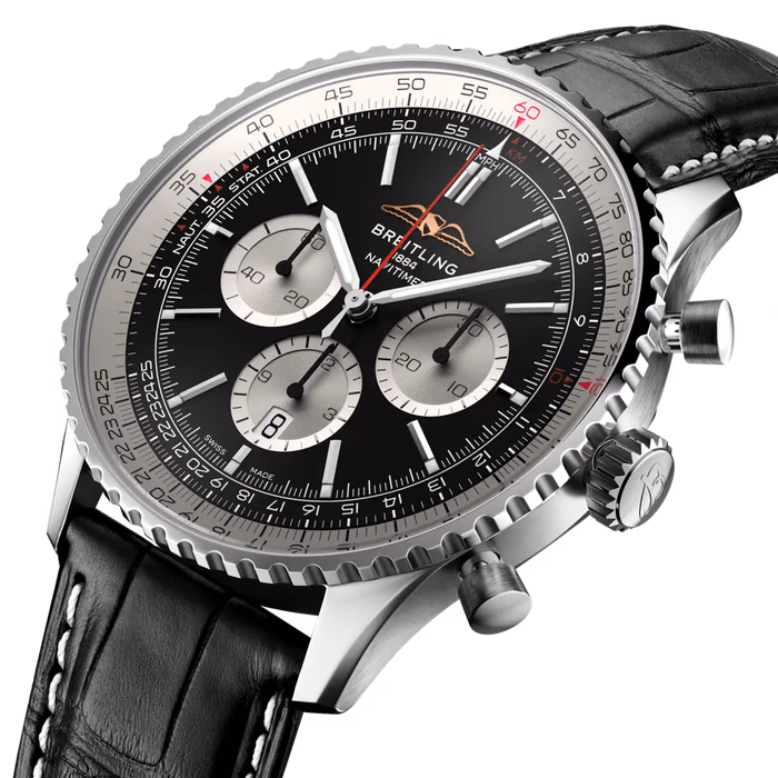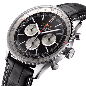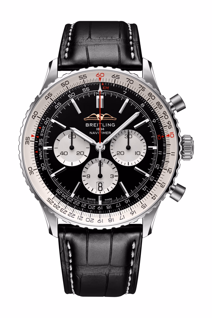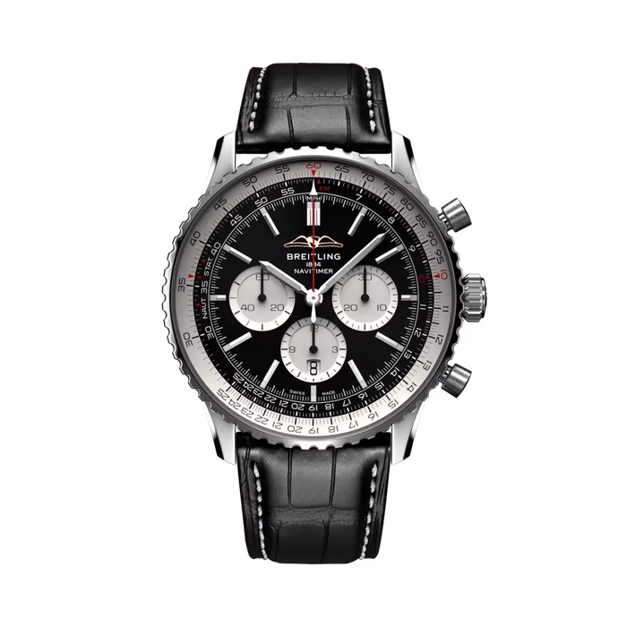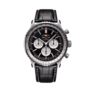 The Breitling Navitimer reference AB0137211B1P1 is part of Breitling's 2022 refresh of the iconic slide rule chronograph. This version has a Stainless Steel case of 46.00mm, which houses the brand's in-house caliber[ CALIBER]. The dial, with AOPA-inspired wing logo, is Black.