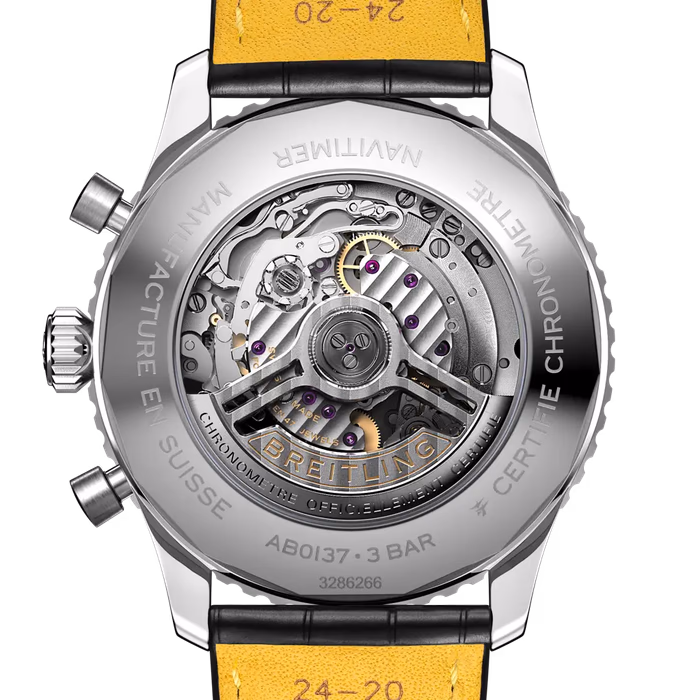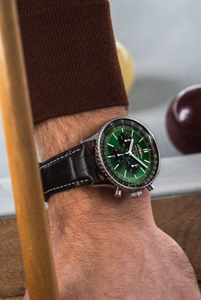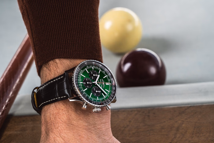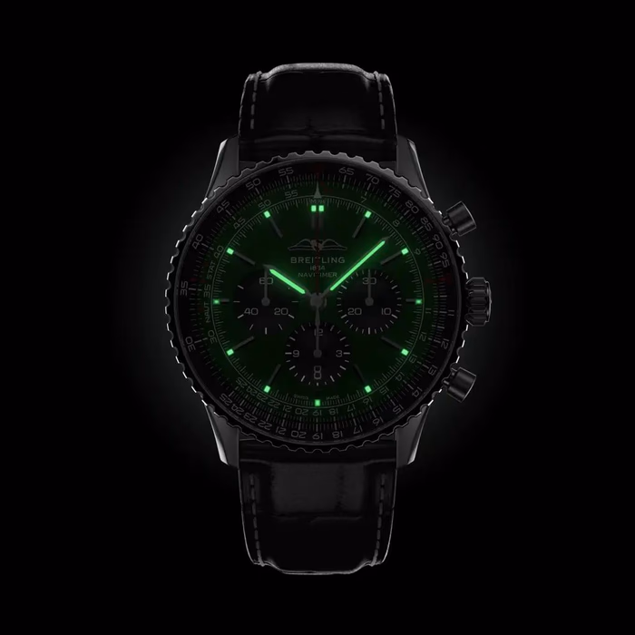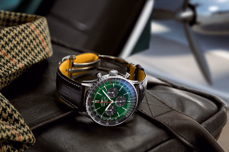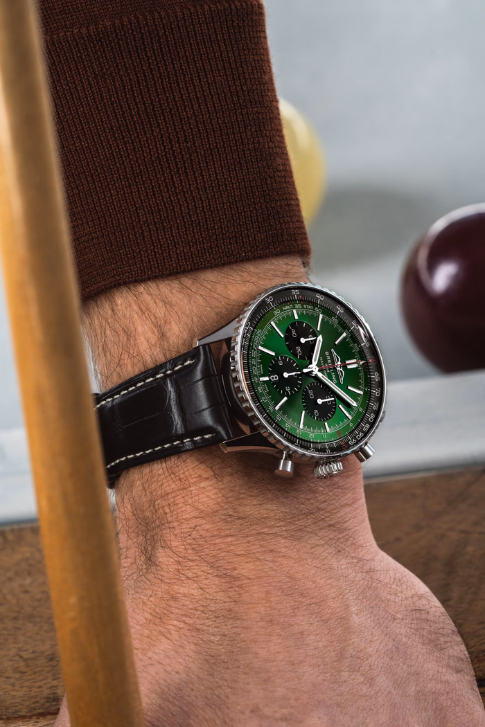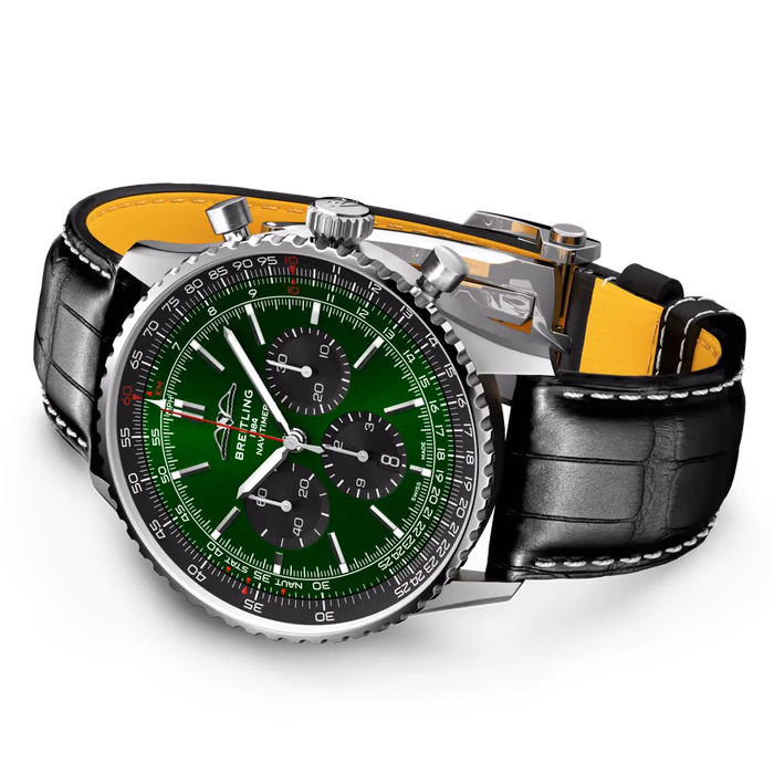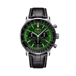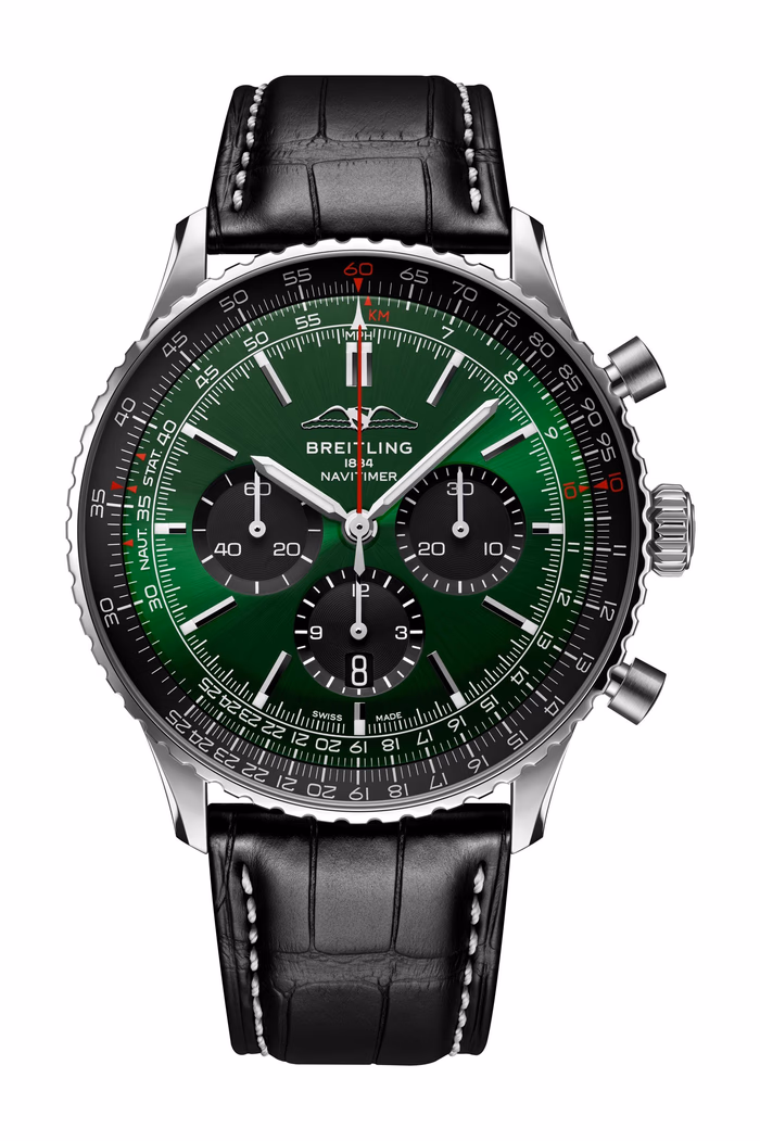 The Breitling Navitimer reference AB0137241L1P1 is part of Breitling's 2022 refresh of the iconic slide rule chronograph. This version has a Stainless Steel case of 46.00mm, which houses the brand's in-house caliber Breitling 01 (Manufacture). The dial, with AOPA-inspired wing logo, is Green.