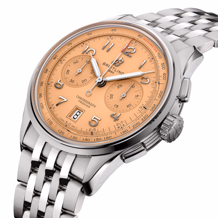 The Premier B01 Chronograph ref. AB0145331K1A1 was introduced in 2023 as a redesign of the original 2018 Premier B01 Chronograph 42. This watch is powered by Breitling's in-house caliber B01 movement, which is fitted inside a stainless steel case of 42mm. The dial is Pink.