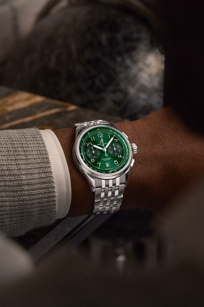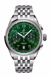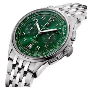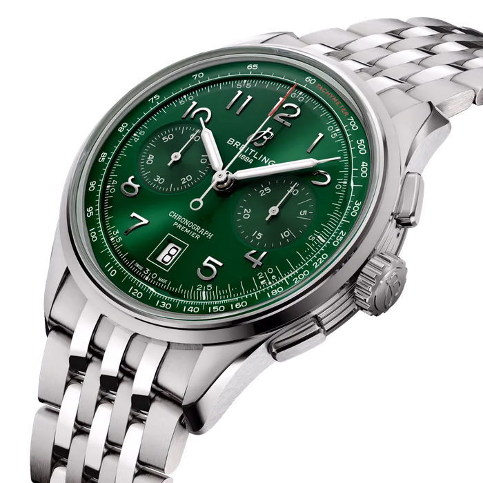 The Premier B01 Chronograph ref. AB0145371L1A1 was introduced in 2023 as a redesign of the original 2018 Premier B01 Chronograph 42. This watch is powered by Breitling's in-house caliber B01 movement, which is fitted inside a stainless steel case of 42mm. The dial is Green.
