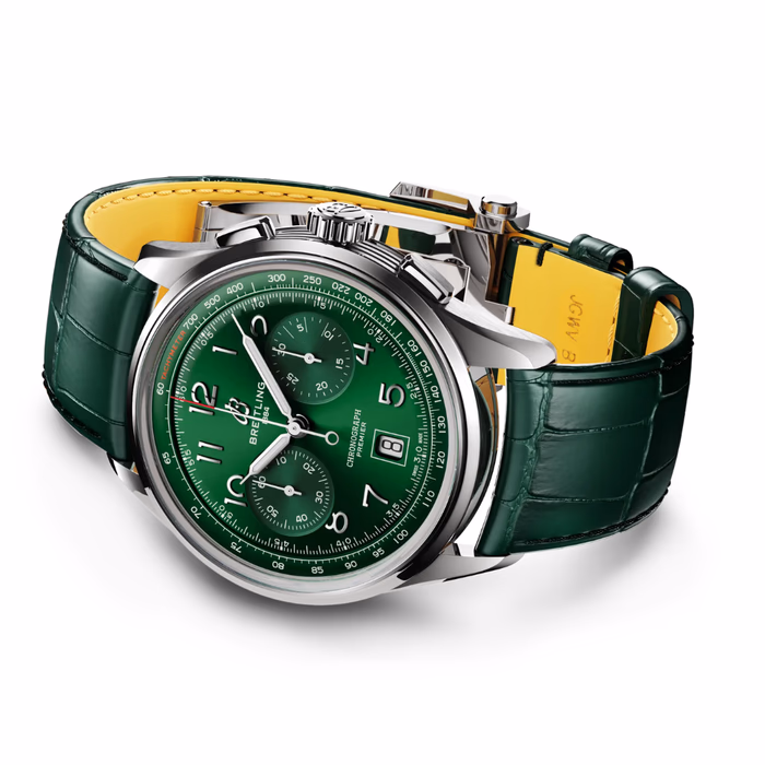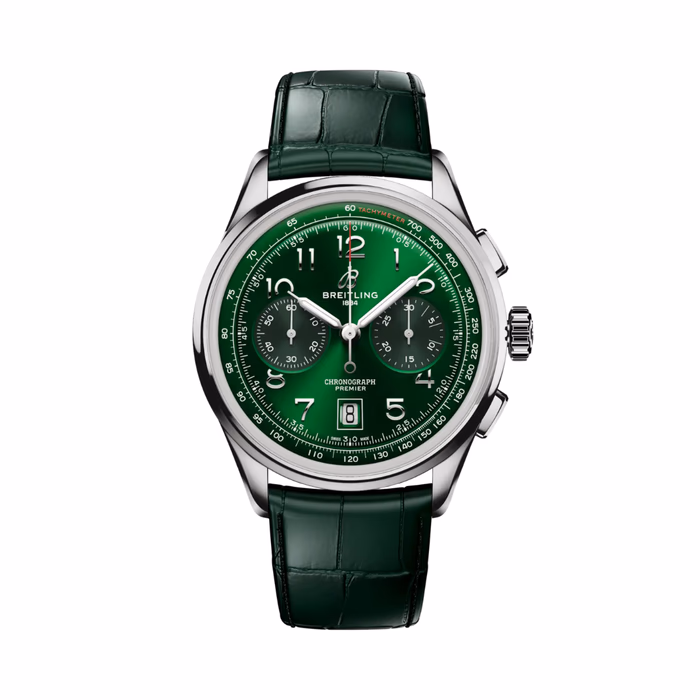 The Premier B01 Chronograph ref. AB0145371L1P2 was introduced in 2023 as a redesign of the original 2018 Premier B01 Chronograph 42. This watch is powered by Breitling's in-house caliber B01 movement, which is fitted inside a stainless steel case of 42mm. The dial is Green. The bracelet is of green leather.