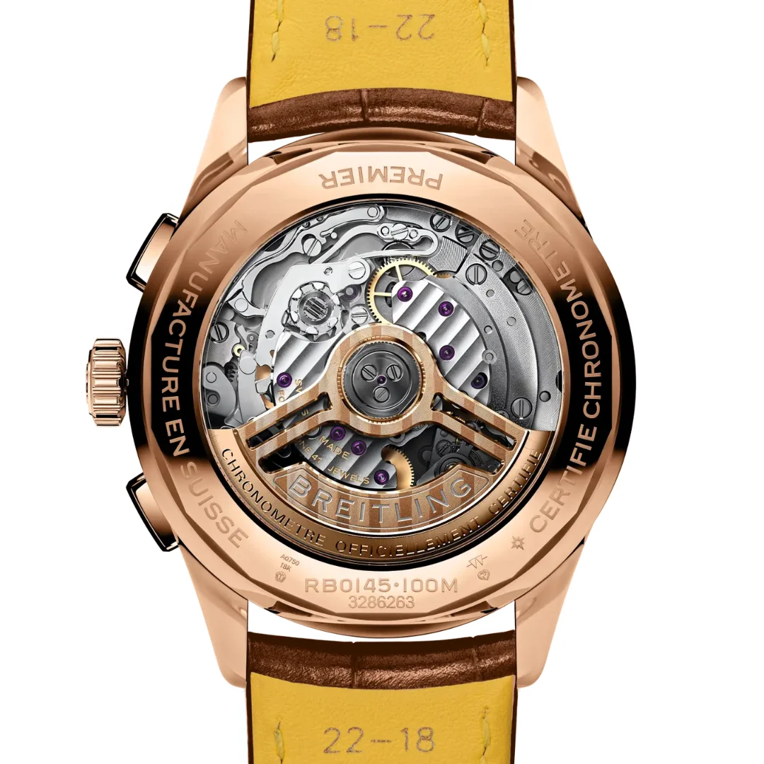 The Breitling Premier B01 Chronograph 42 RB0145171C1P1 was introduced in 2025 and is presented on a gold-brown alligator leather strap secured by an 18 k red gold folding clasp. This model features a 42 mm case in 18 k red gold with a thickness of 13.6 mm. The case is fitted with a cambered sapphire crystal glareproofed on both sides, a sapphire display back, and a fixed bezel. Water resistance is rated at 10 bar (100 meters). The blue dial is enhanced by applied Arabic numerals. Powering the watch is the Breitling 01 (Manufacture), an in-house automatic chronograph movement with a power reserve of approximately 70 hours.