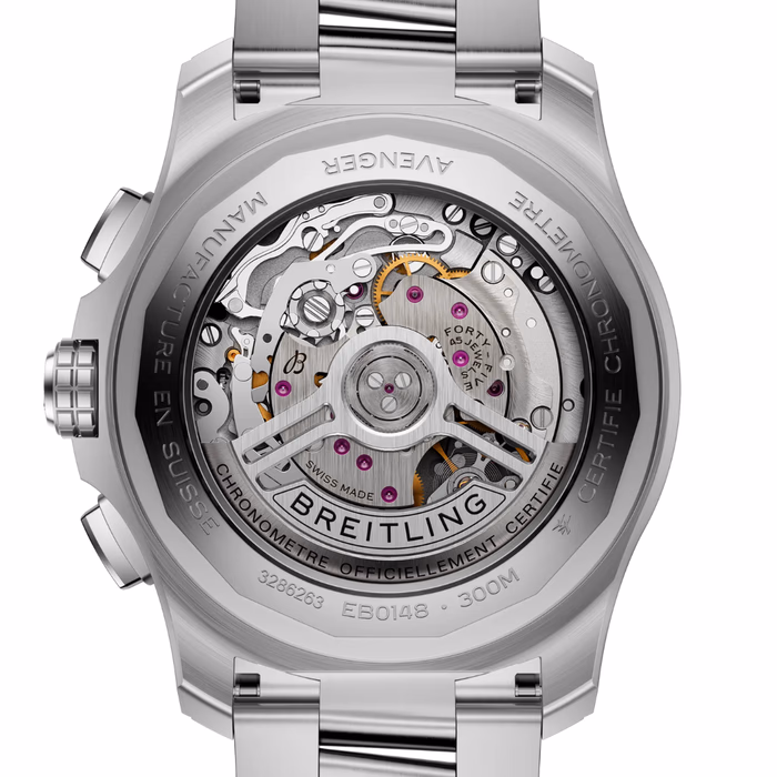The Breitling Super Avenger B01 Chronograph 46 EB0148101B1E1 debuted in 2024 as a larger alternative to the regular Avenger B01 variations. This watch has a stainless steel case of 46.00mm, water resistant up to 300 meters, which houses the brand's in-house caliber Caliber B01. For this version, the dial is Black.