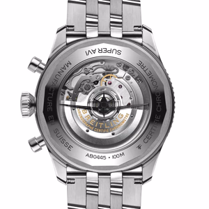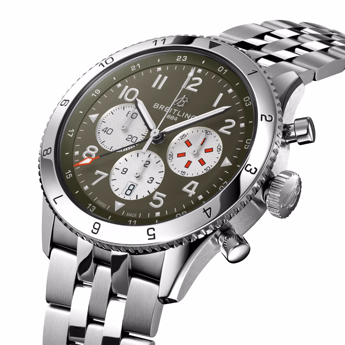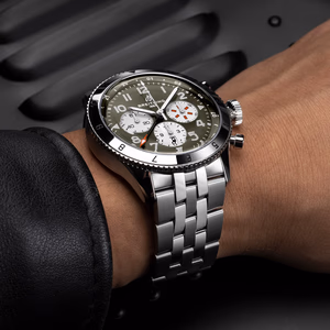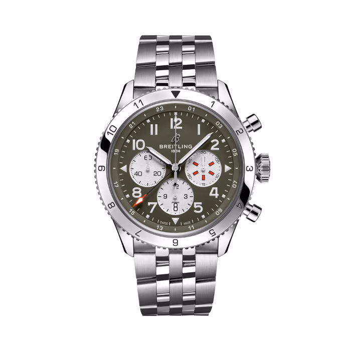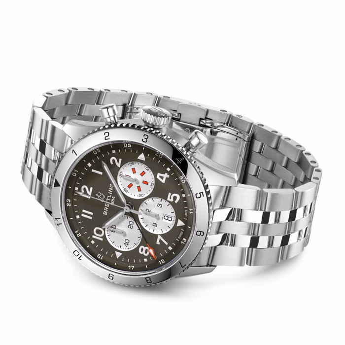The Breitling Super AVI B04 Chronograph GMT reference AB04452A1L1A1 was introduced in 2022. A contemporary take on the classic 1953 reference 765 AVI, this watch features a Stainless Steel case of 46.00mm, which houses the self-winding caliber Caliber B04. The dial is Green.