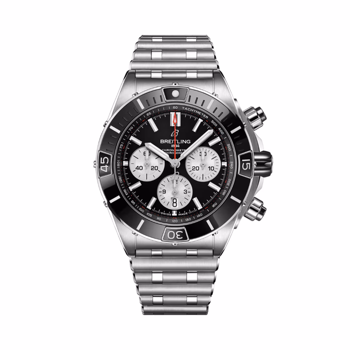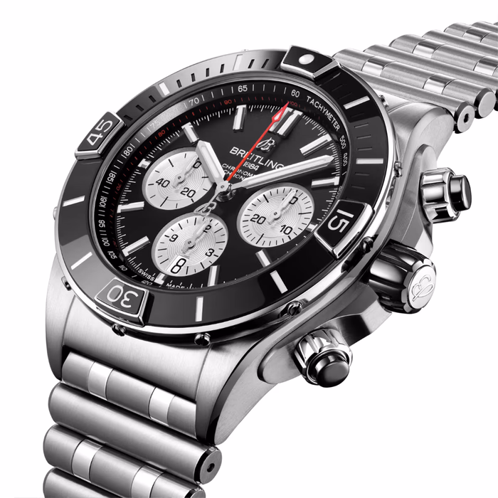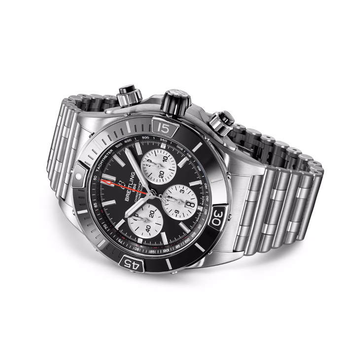The 2021 Breitling Super Chronomat reference AB0136251B1A1 has a stainless steel case of 44.00mm, which houses the self-winding caliber Caliber B01. Both dial and the ceramic bezel are Black. It comes fitted with a Rouleaux-style bracelet .