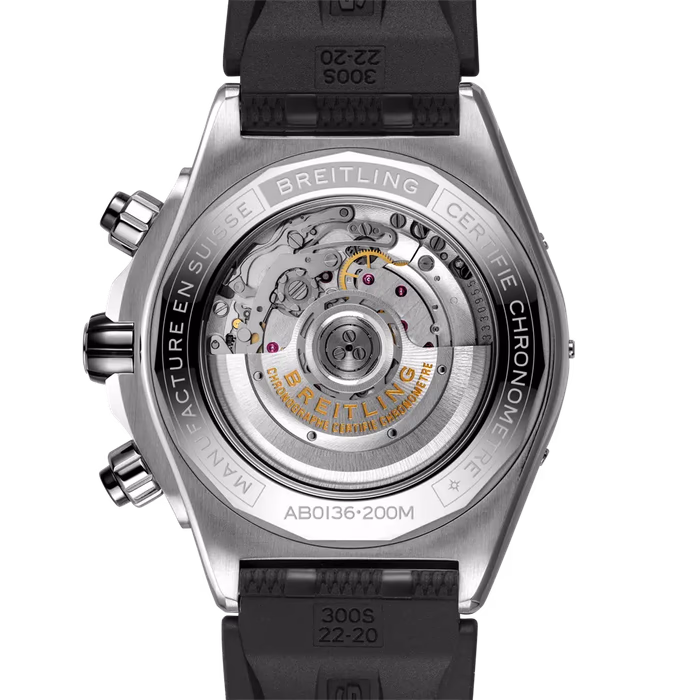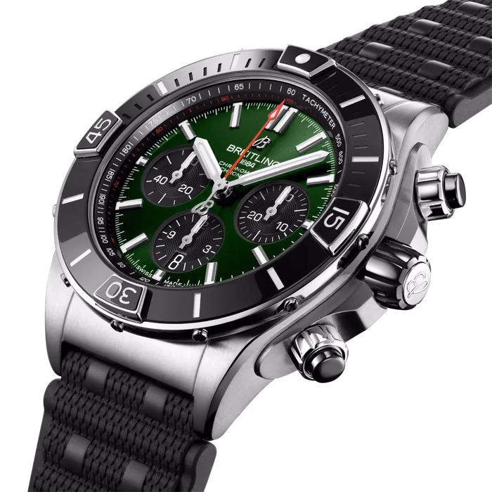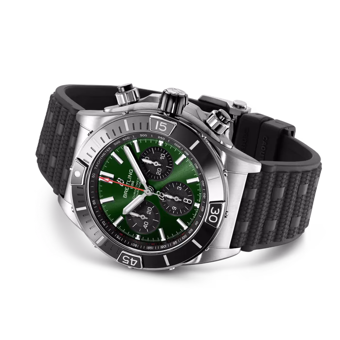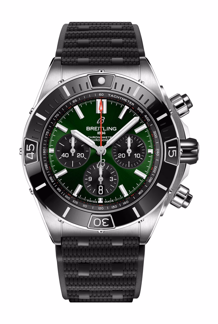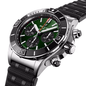 The 2021 Breitling Super Chronomat reference AB0136251L1S1 has a stainless steel case of 44.00mm, which houses the self-winding caliber Caliber B01. The dial is Green.
