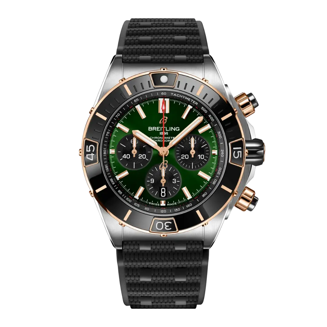The 2022 Breitling Super Chronomat reference UB0136251L1S1 has a stainless steel and red gold case of 44.00mm, which houses the self-winding caliber Caliber B01. The dial is Green. The Super Chronomat comes in several colour and metal variations, from stainless steel to 18 k red gold. It either features the iconic Rouleaux bracelet or a rubber Rouleaux-inspired strap, matched with a folding clasp. The Super Chronomat B01 44 is powered by the Breitling Manufacture Calibre 01, a COSC-certified chronometer.