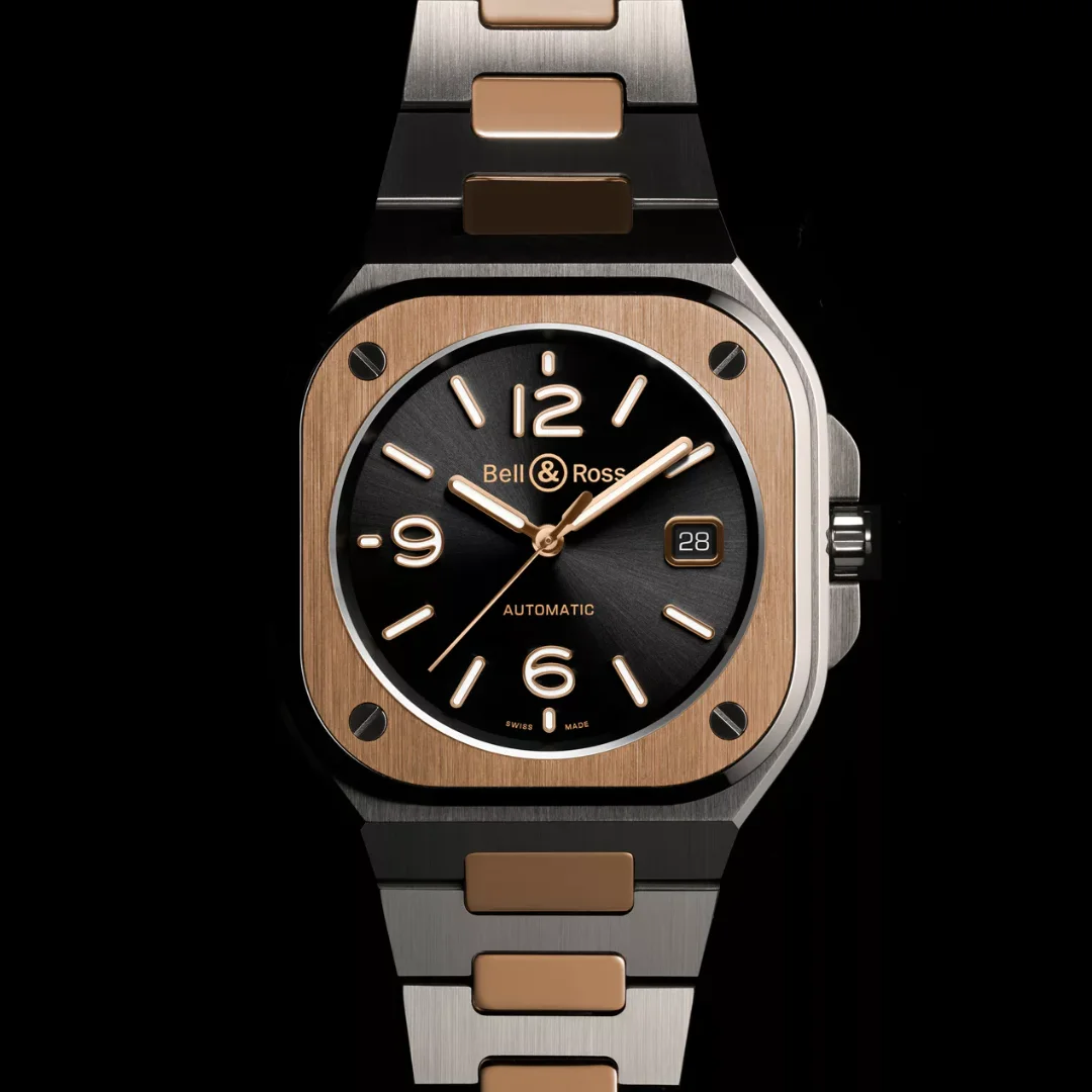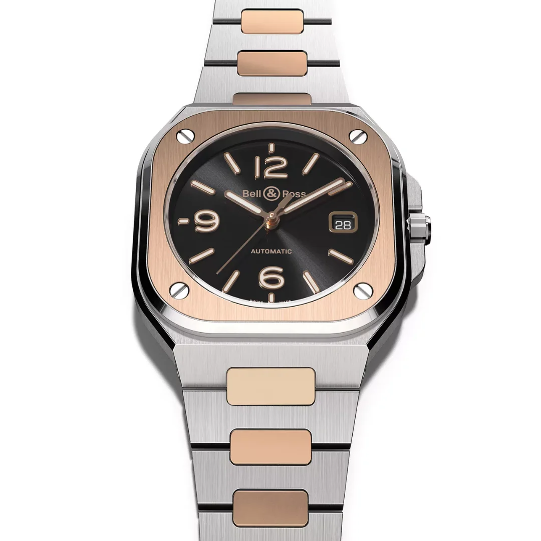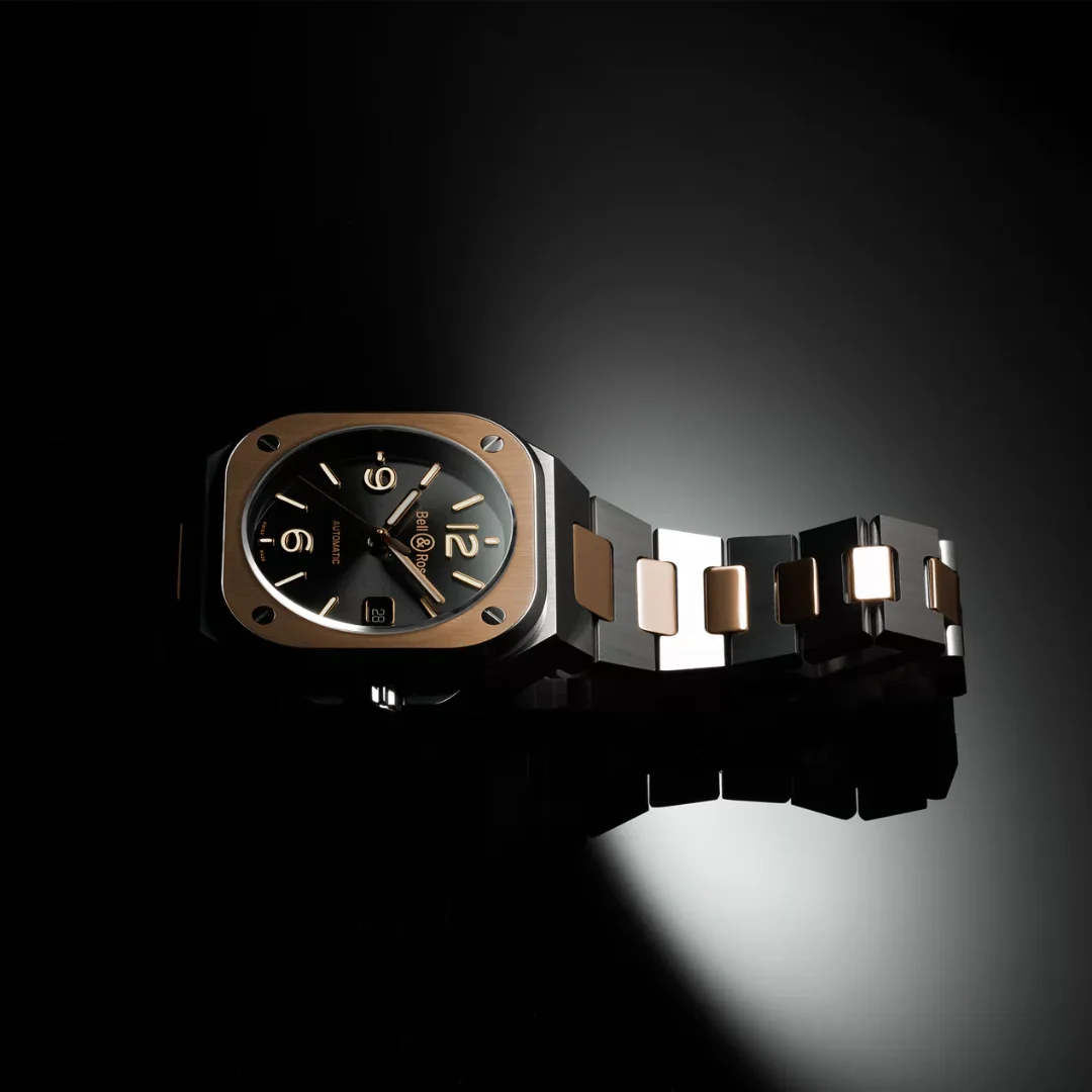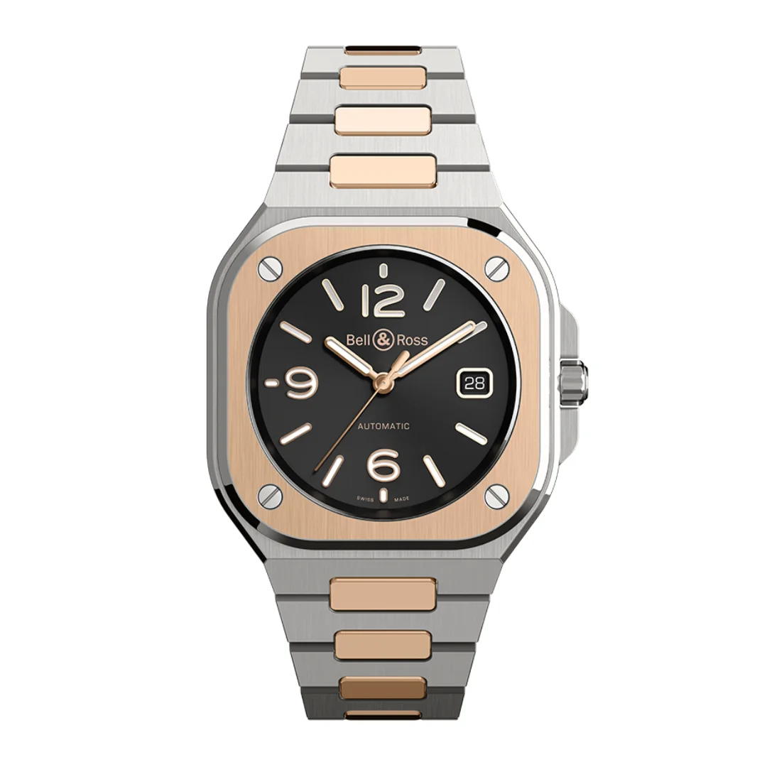 The Bell & Ross BR-05 Black Steel & Gold Ref. BR05A-BL-STPG/SSG with its smart and classic look, this second addition to the BR-05 urban collection takes you back into the 80's spirit by mixing two-tone. When a technical material meets a precious substance.