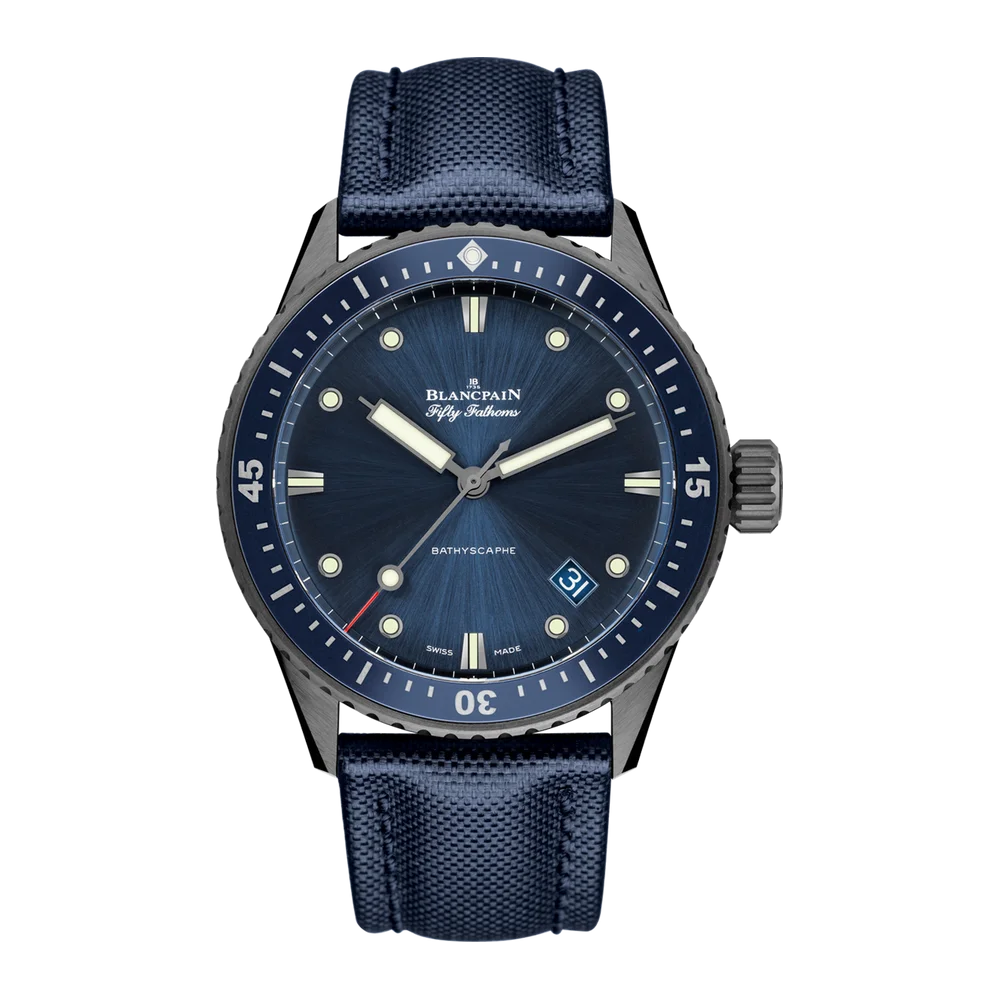 The Blancpain Fifty Fathoms Bathyscaphe in grey ceramic was introduced in 2016. The case measures 43.6mm across at a height of 13.8, housing the self-winding caliber 1315. Both dial and bezel, the latter in ceramic with LiquidMetal indexes, are blue. This version is fitted with a blue sailing strap.