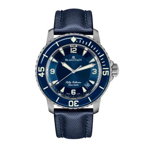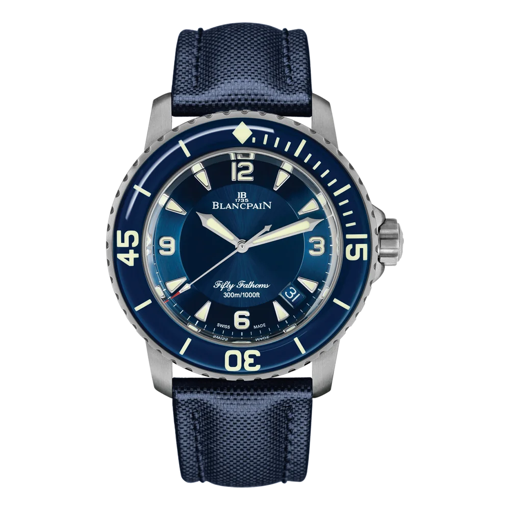 The Blancpain Fifty Fathoms Automatique Ref. 5015 12B40 O52A has a titanium case of 45.00mm, and a Blue dial. This watch is powered by caliber 1315.