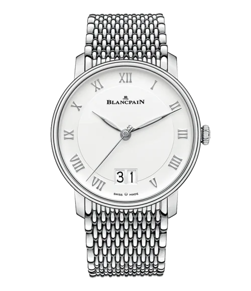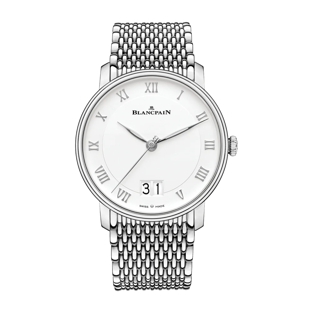 The Blancpain Villeret Grande Date Ref. 6669 1127 MMB features a case of 40mm with the stepped bezel that has become synonymous with this collection. It is motivated by the self-winding caliber 6950, providing this gentleman's wristwatch with a big date display and center seconds. Reference 6669-1127-MMB has a stainless steel case and a white dial. It is fitted with a 'Mille Mailles' bracelet.