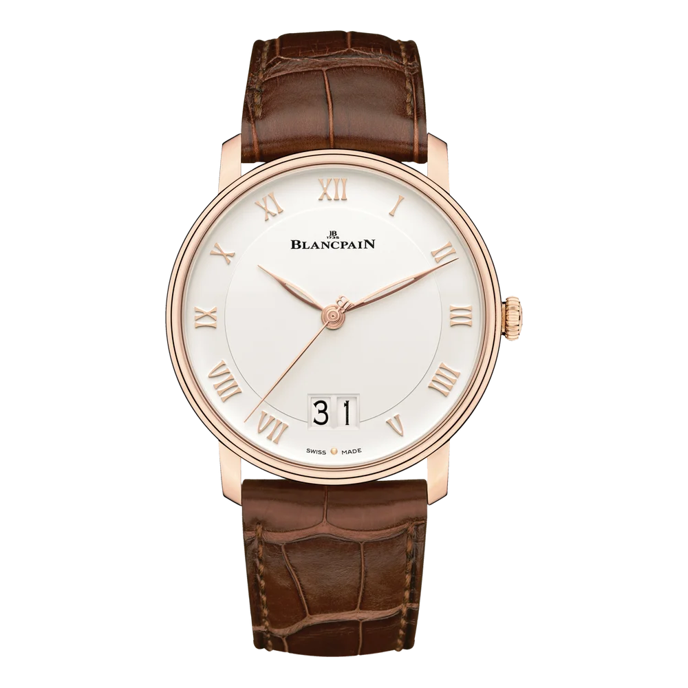 The Blancpain Villeret Grande Date features a case of 40mm with the stepped bezel that has become synonymous with this collection. It is motivated by the self-winding caliber 6950, providing this gentleman's wristwatch with a big date display and center seconds. Reference 6669-3642-55B has a red gold case and a opalin white dial.