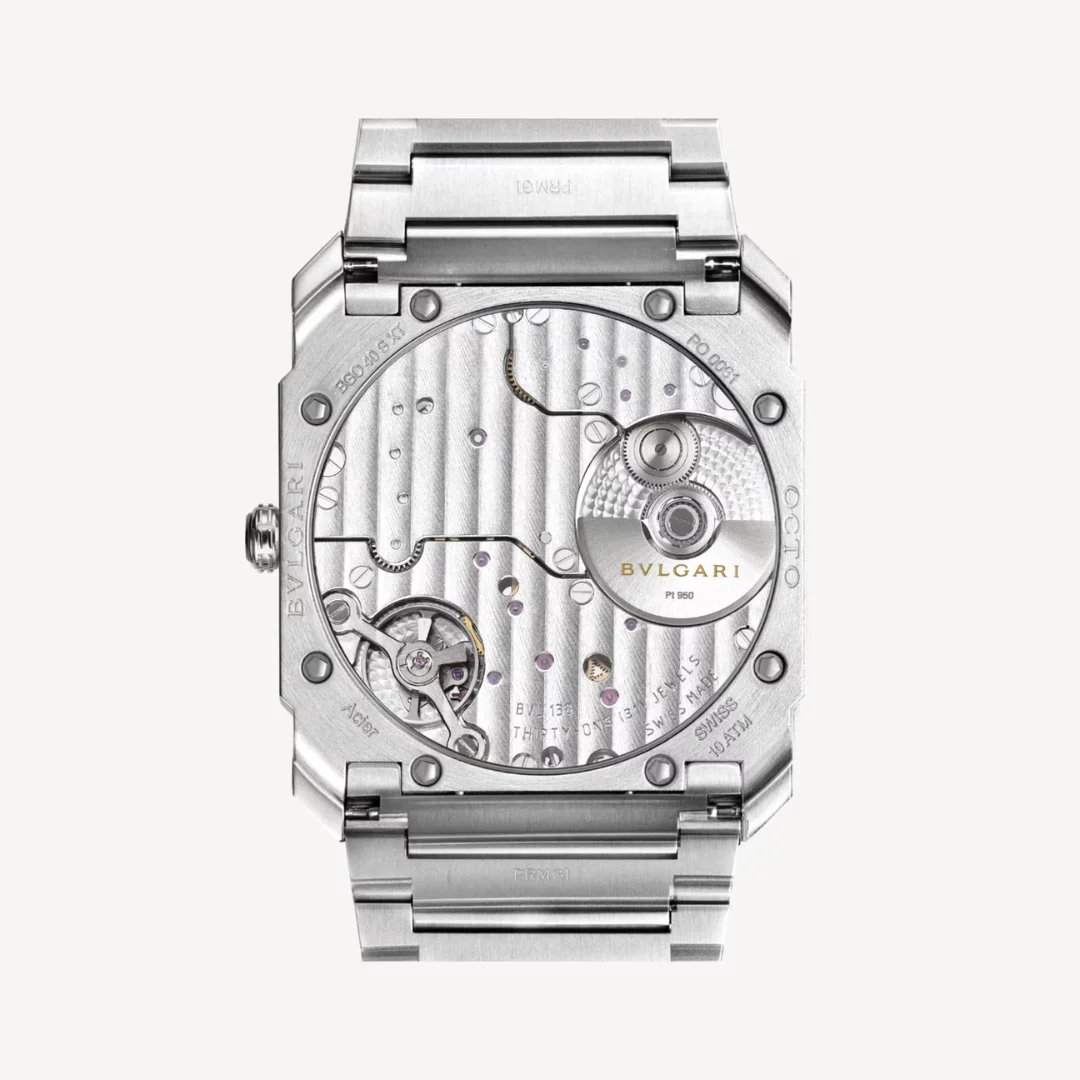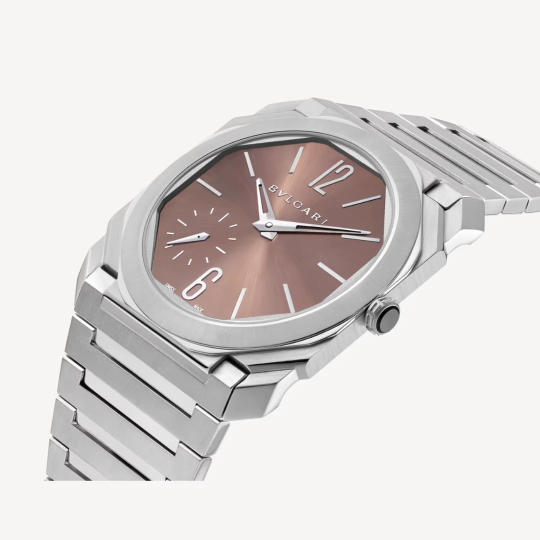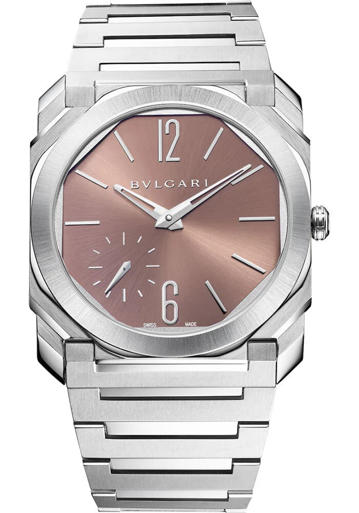Octo Finissimo Automatic Uhr Ref. 103856 aus seidenmattem Edelstahl mit extraflachem mechanischen Manufakturwerk (2,23 mm hoch), Automatikaufzug und lachsrosafarbenem Metallic-Zifferblatt mit Sonnenschliff sowie applizierten rhodinierten Markierungen. Wasserdicht bis 100 Meter.