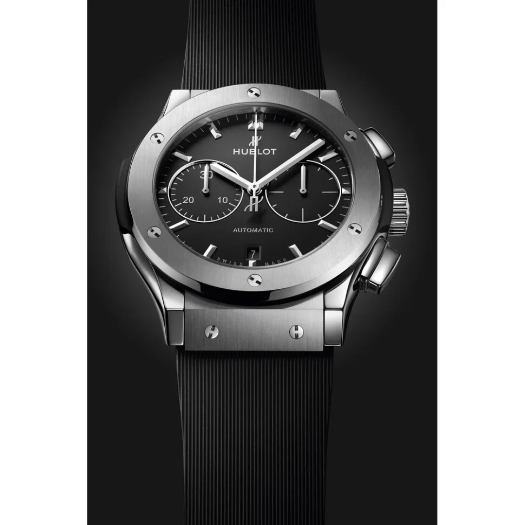 The Hublot Classic Fusion Chronograph 521.NX.1171.RX has a titanium case of 45.00mm, which houses the caliber HUB1143 - a self-winding movement with chronograph and date. The dial is Black.