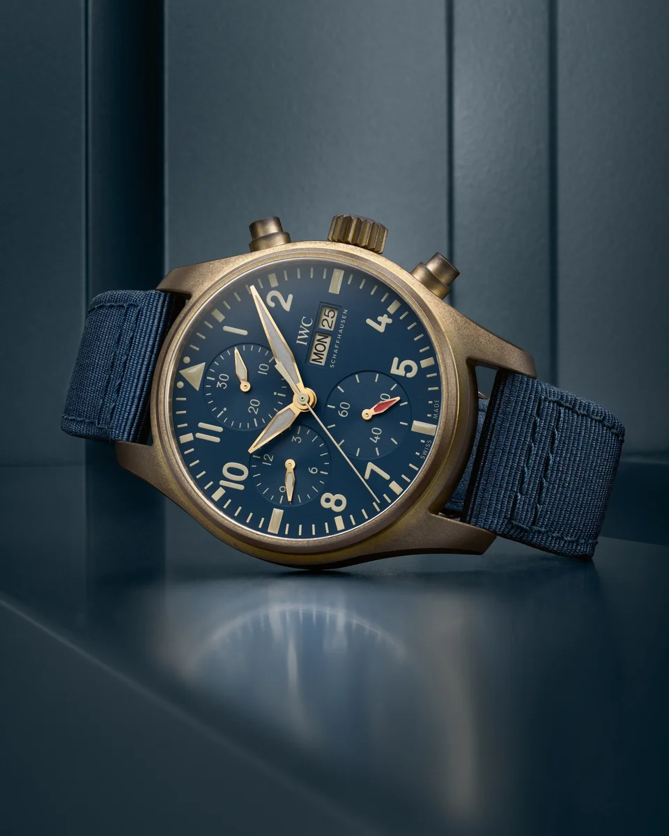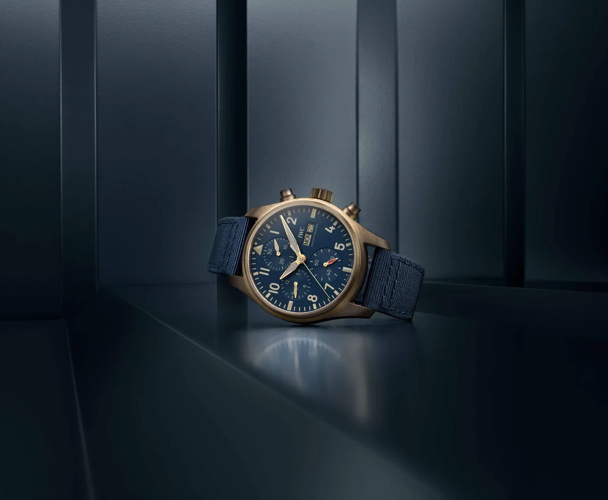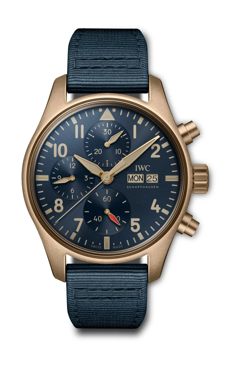 The IWC Pilot's Watch Chronograph IW3881-09 debuted in 2022. This watch has a bronze case with titanium case back, paired with a Blue dial. Power comes from the self-winding caliber 69385.