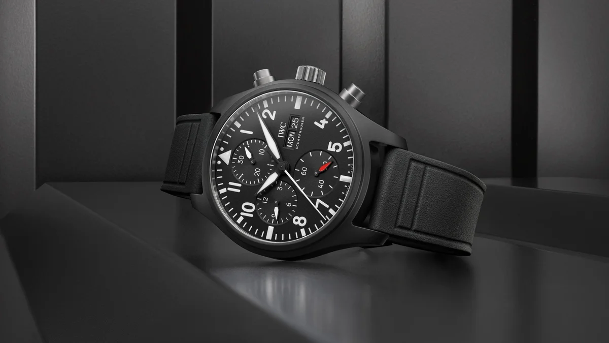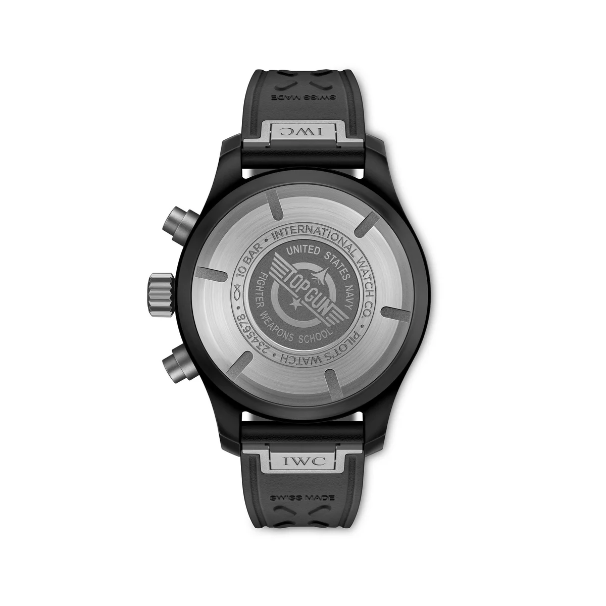 The IWC Pilot's Watch Chronograph Top Gun IW389401 was introduced in 2023. This watch features a matte black ceramic case of 41.90mm, fitted with a titanium case back, which houses IWC's in-house caliber 69380. Both the dial and the textile strap are equally black for the ultimate stealth look.
