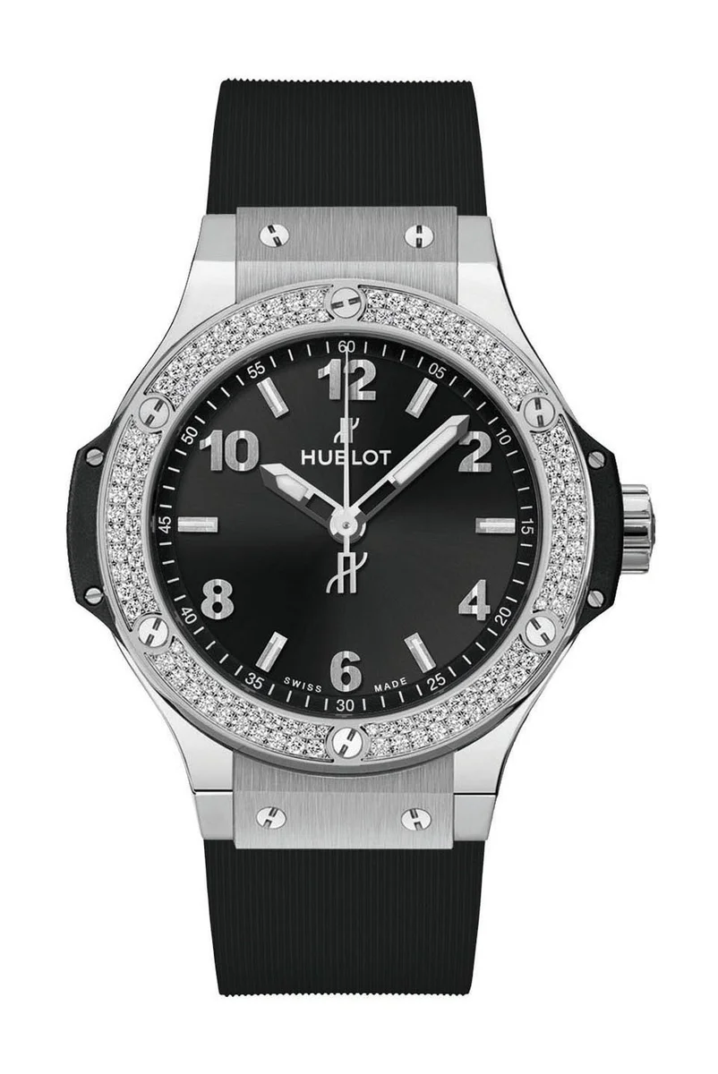 The Hublot Big Bang 361.SX.1270.RX.1104 has a stainless steel case with diamond-set bezel and a Black dial. This watch is powered by caliber HUB2900, a quartz movement with central seconds. 126 diamonds, 0.87 carats