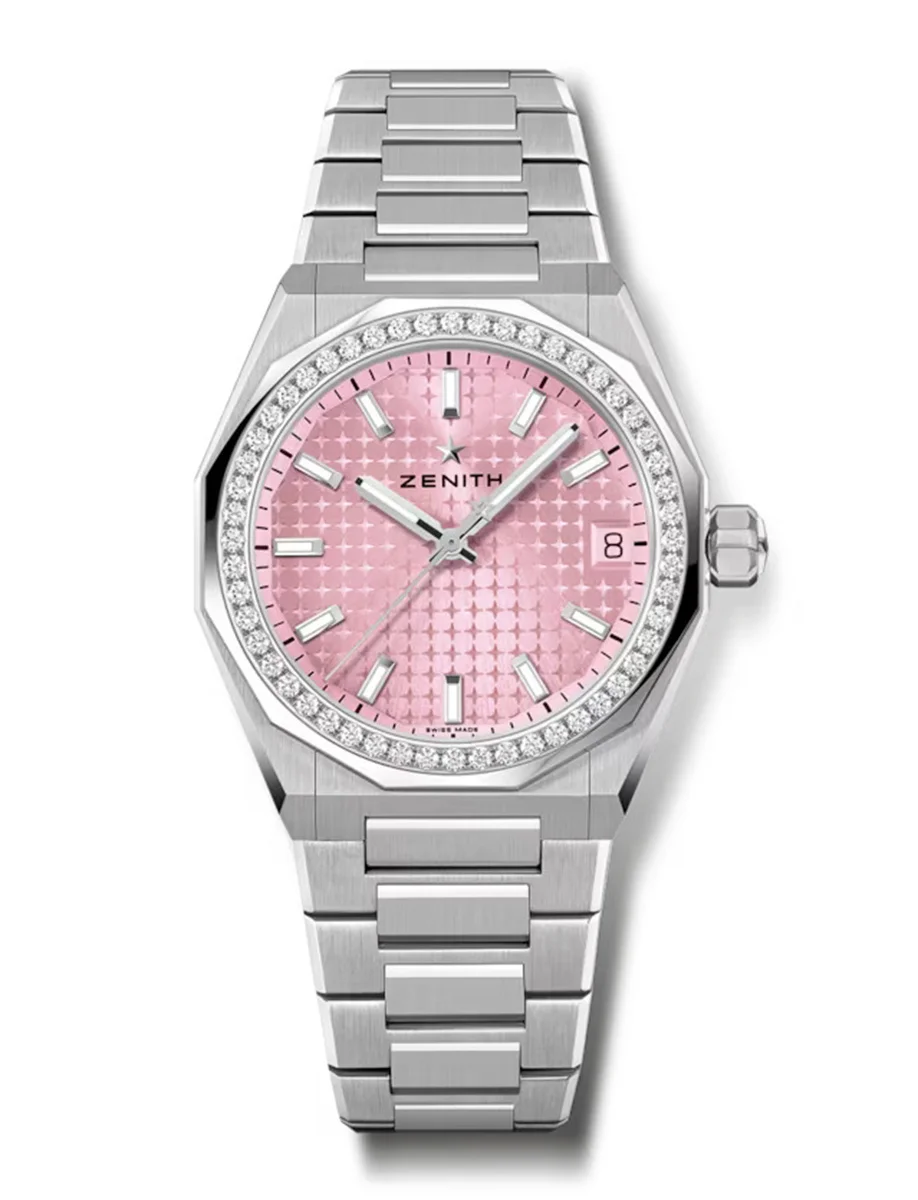 DEFY Skyline in a 36mm steel octagonal case with a diamond-set faceted bezel, featuring a metallic pastel pink sunburst-patterned dial revisiting the emblematic ZENITH four-pointed star. Powered by the Elite 670 automatic manufacture movement. Interchangeable steel bracelet and pink patterned rubber strap.