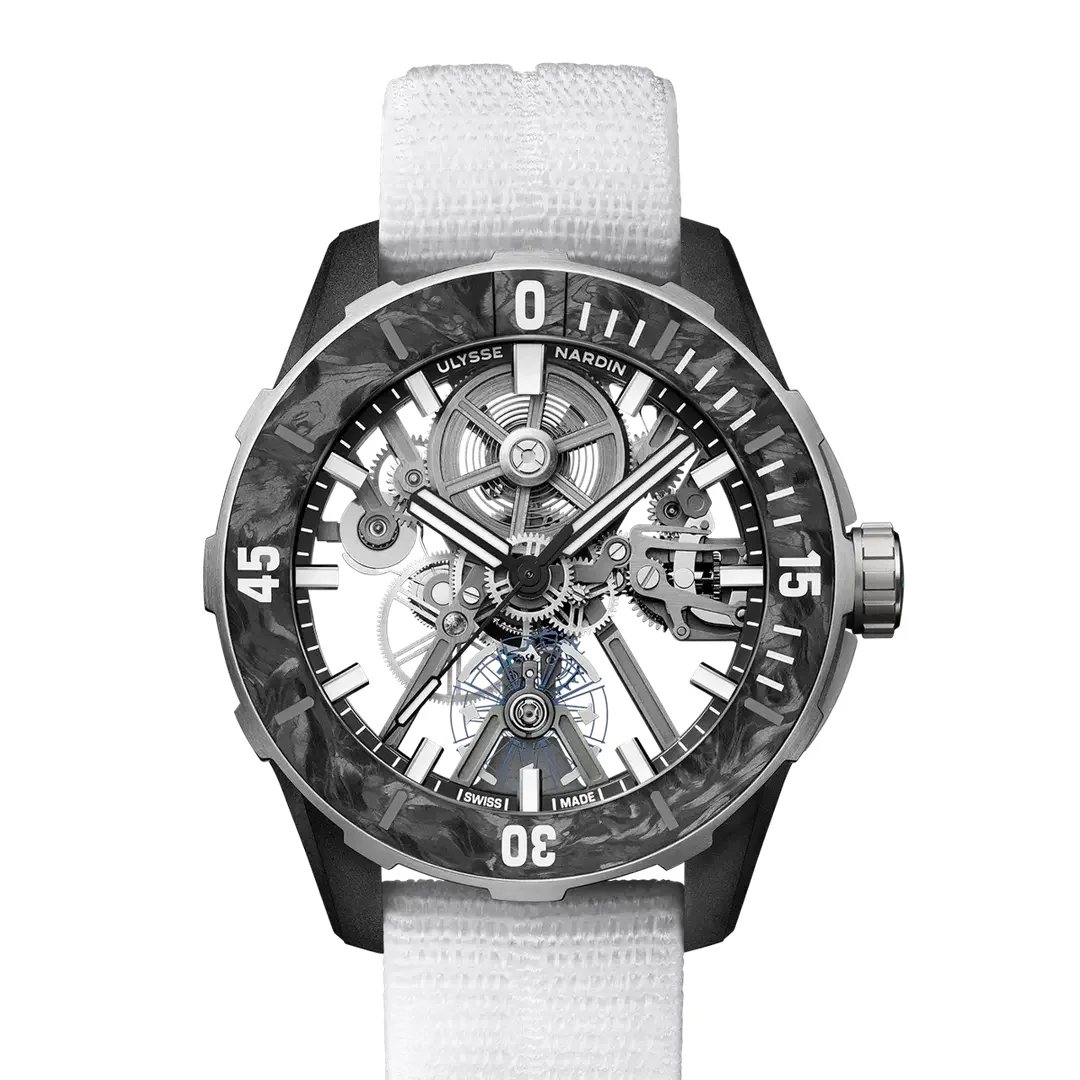 Ulysse Narding DIVER AIR Ref. 3743-170-2A/0A with a 44mm case in a Titanium / Nylon / Carbon Fibre mix. Total weight of just 51.51g. Building upon the foundation of the Diver X Skeleton UN-372 movement, Ulysse Nardin developed a new, innovative, hightech calibre, the UN-374, which had to be entirely rethought and redesigned. To achieve the Diver [AIR]’s exceptionally light weight of just 52g, including the strap, and under 46g without it, material had to be removed from the Diver X Skeleton’s calibre, while ensuring the watch’s reliability and performance remained uncompromised.
