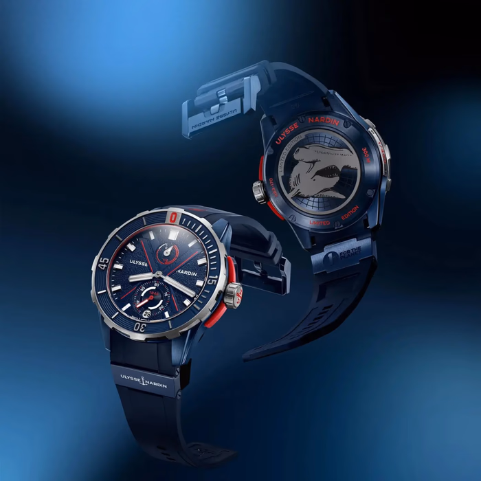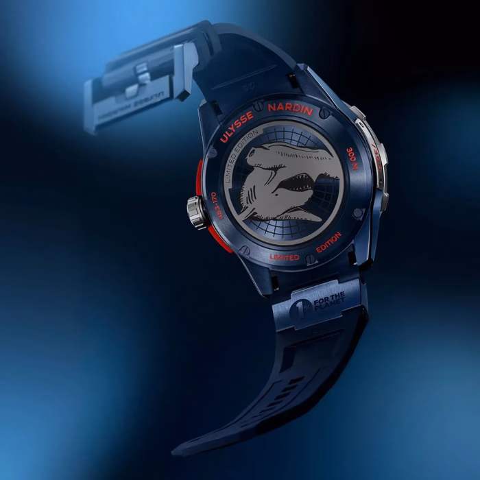 Ulysse Nardin Diver Hammerhead Shark Ref. 1183-170LE-3A-HAMMER/3A with a 44 mm case size. Ulysse Nardin introduces the Diver Hammerhead Shark, a high-horology dive watch that reflects Ulysse Nardin’s rich legacy of marine precision. The innovative dive watch has a 44 mm blue PVD-coated titanium case and is packed with essential features for extreme underwater performance.