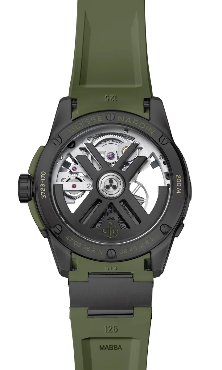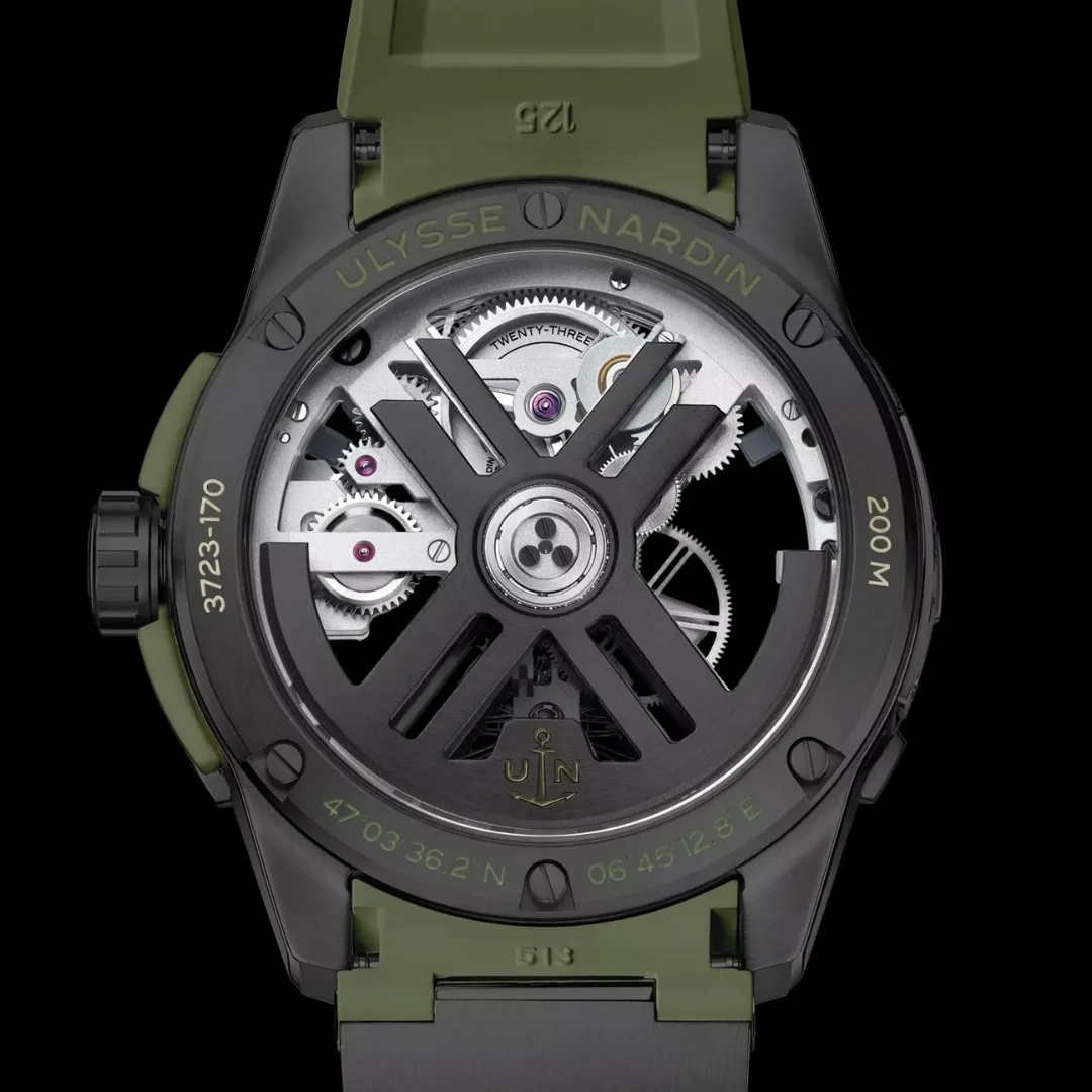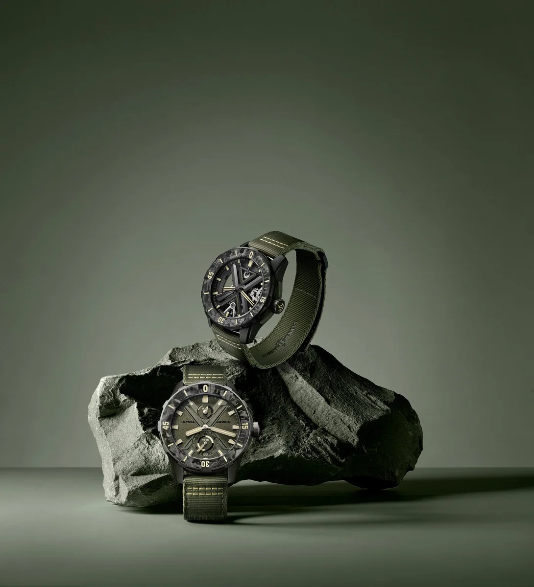 The Diver [X SKELETON OPS] ref. 3723-170-2C/3A is an avant-garde dive watch reimagined as Haute Horlogerie. It features a 44 mm case, water resistance up to 200 meters, and the skeletonized automatic movement UN-372 with a silicon escapement and oversized oscillator. The watch showcases Carbonium® in both the bezel and barrel cover. Its ultra-modern design includes a prominent skeleton X structure on the dial and a lightweight titanium case with a black DLC coating. Completing its bold style and sustainable approach is a khaki green fabric strap made partly from upcycled fishing nets or a green rubber strap. A sporty appeal, while taking a radical step towards transparency Diver X Skeleton is an explosive fusion between the sporty design of a Diver and technical prowess of the Blast Skeleton.