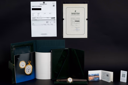 The watch also comes with Audemars Piguet Japan service papers from 2025, confirming a movement service only (no polishing), preserving the original sharp case geometry.