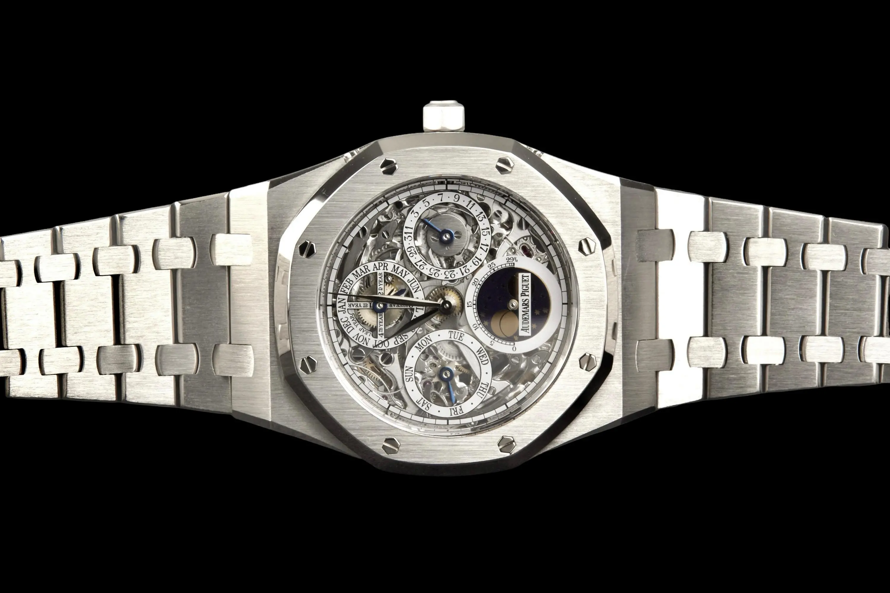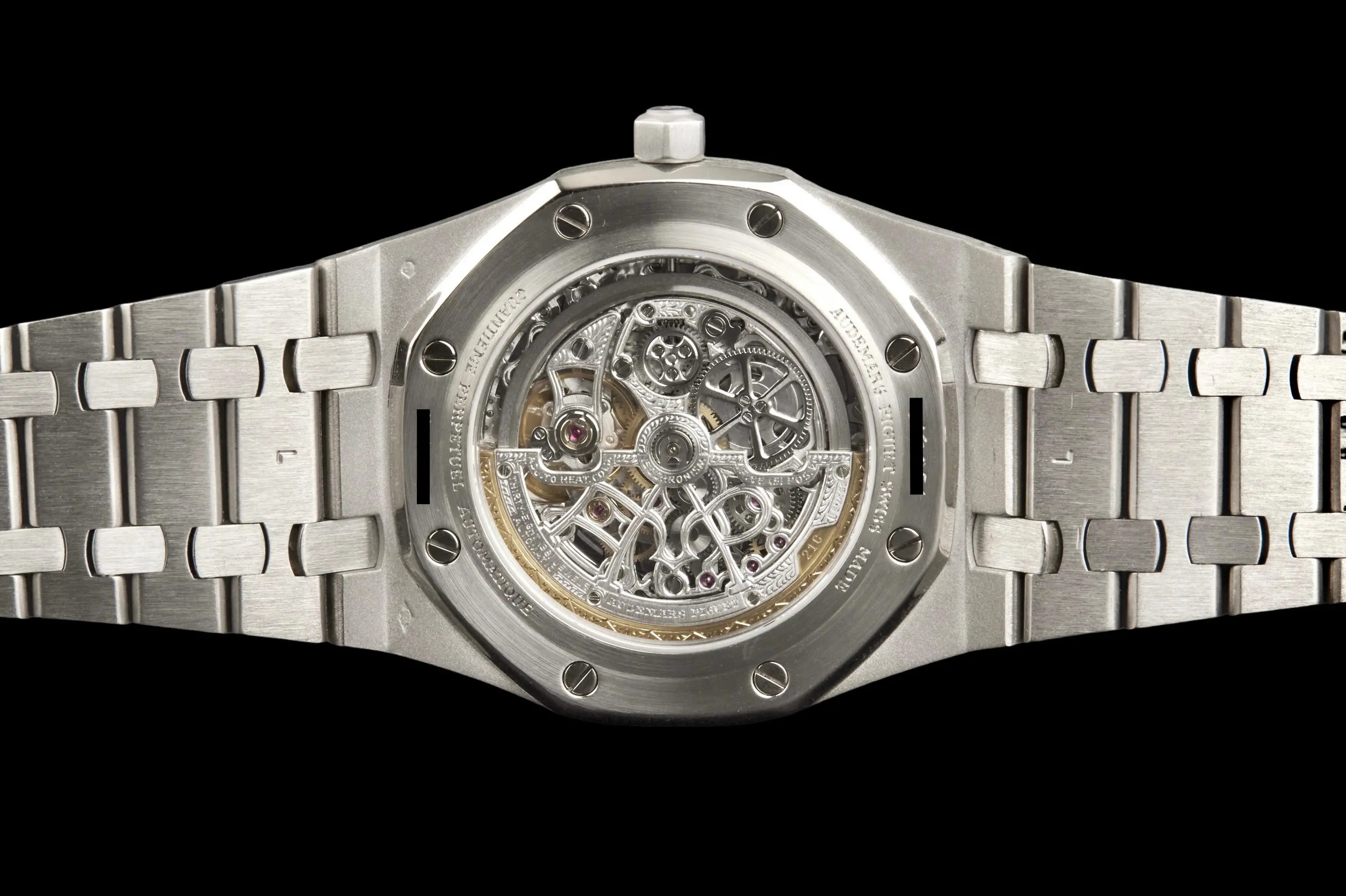 Audemars Piguet Royal Oak Quantième Perpétuel Squelette, reference 25829PT.00.0944PT.01, platinum openworked wristwatch with bracelet, Extract from the Archives, circa 2008.