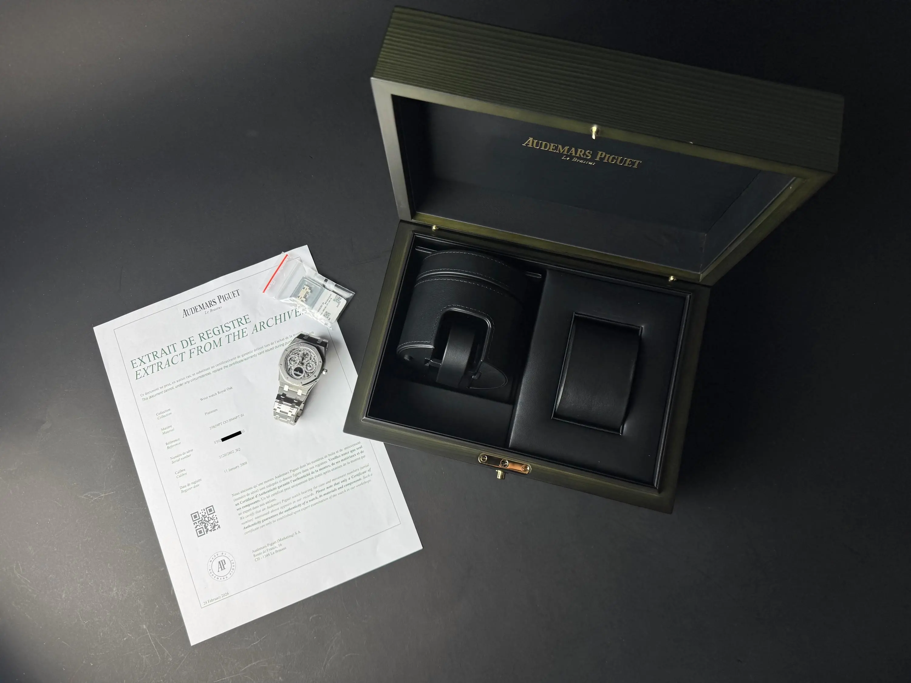 It is accompanied by an Extract from the Audemars Piguet Archives, confirming its production in 2008, as well as a more recent Audemars Piguet winder box.