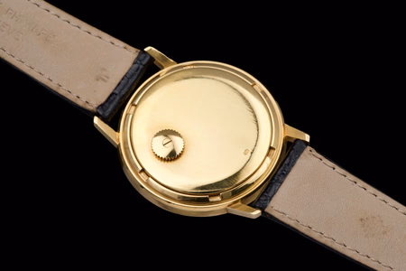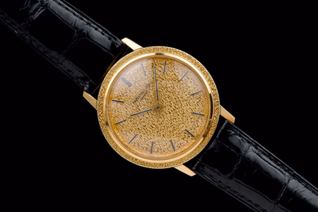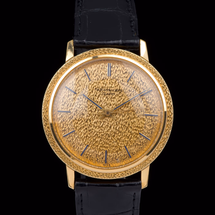 A beautifully preserved vintage Patek Philippe Calatrava from 1971, featuring a 35mm 18k yellow gold case and an automatic movement. The dial is particularly striking: a beautifully decorated hammered-style gilt dial