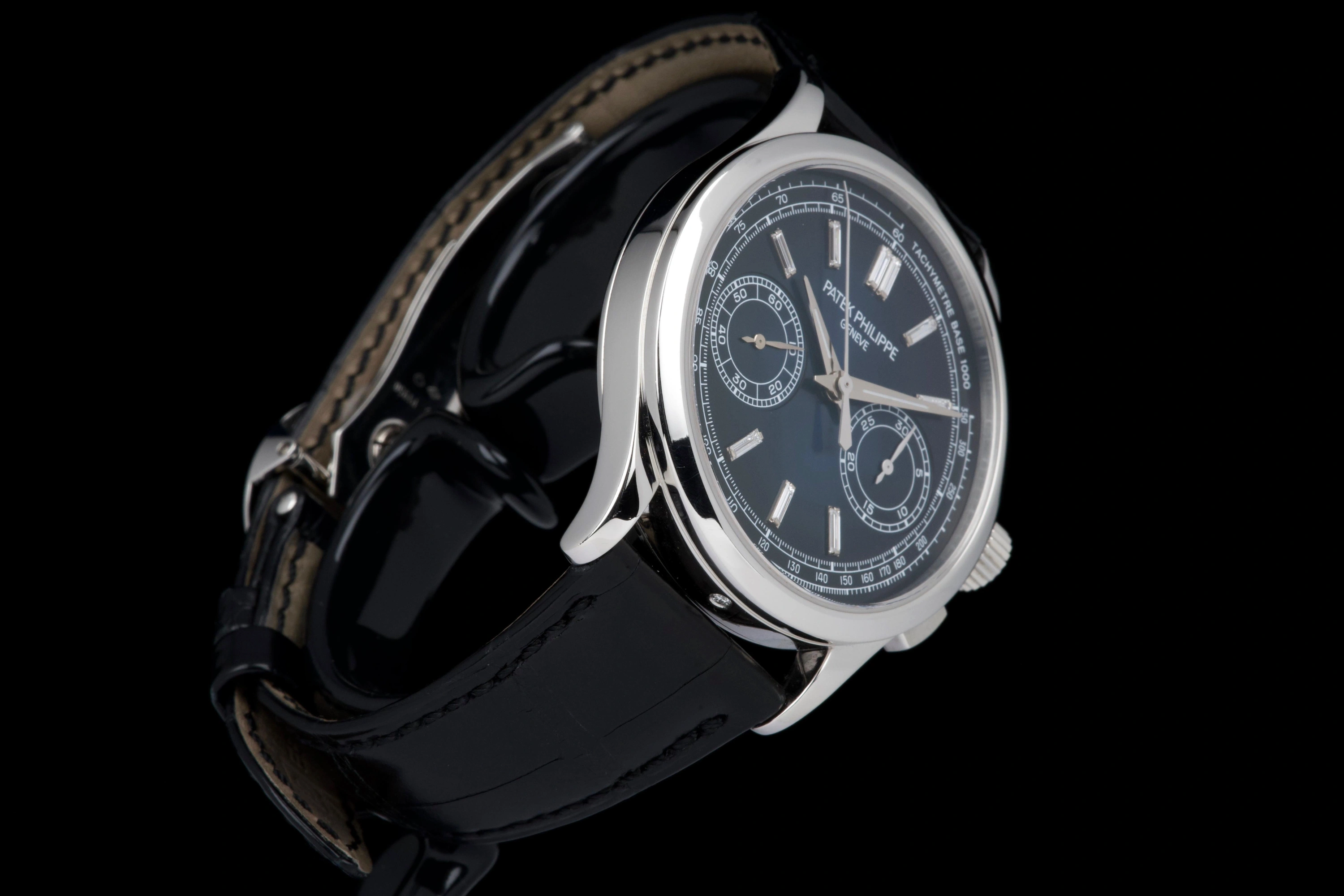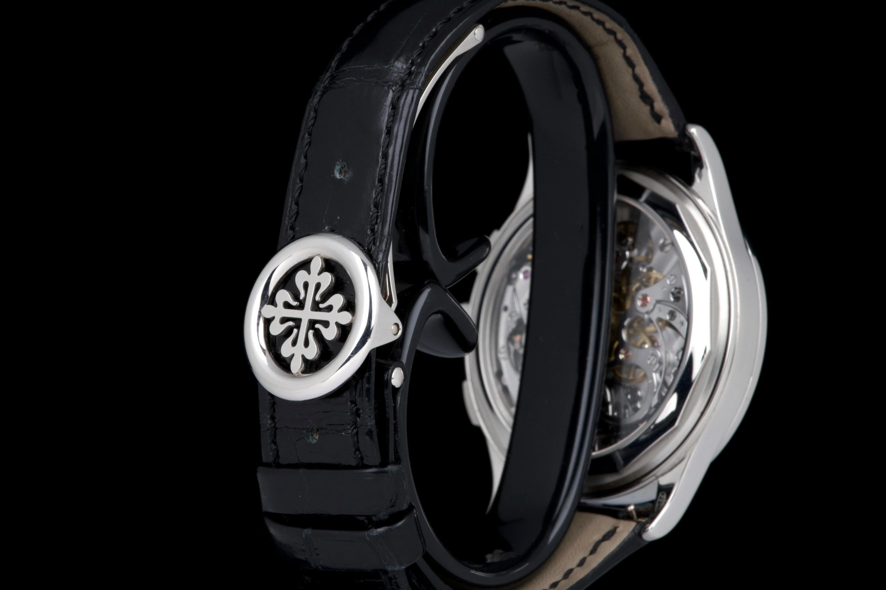 It is fitted with a black alligator strap in excellent condition and the original platinum deployant clasp.