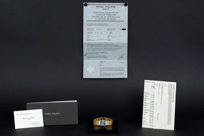 Accompanied by its original papers, booklets, and even the original business card from the historic Patek Philippe boutique — a charming touch of period provenance.