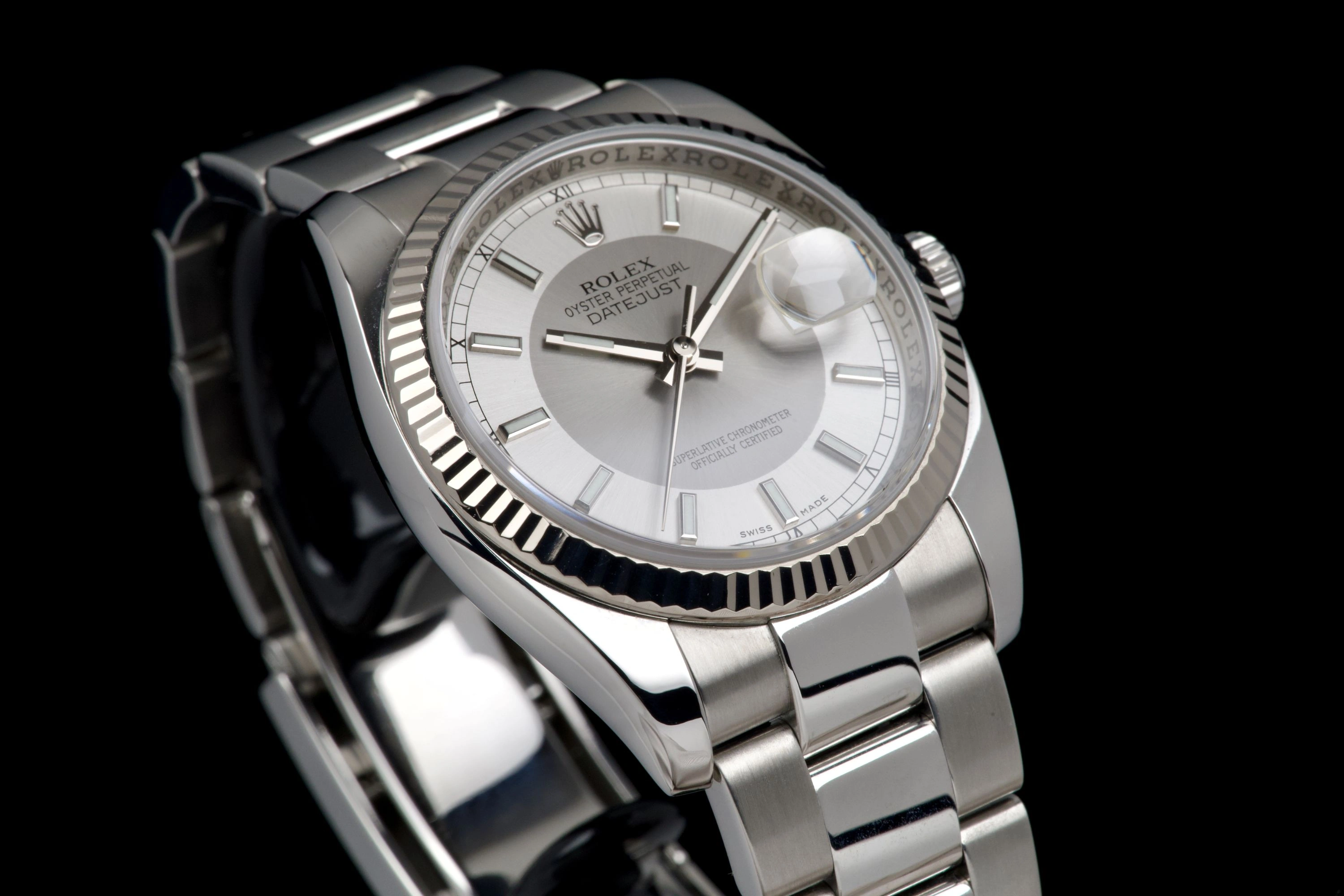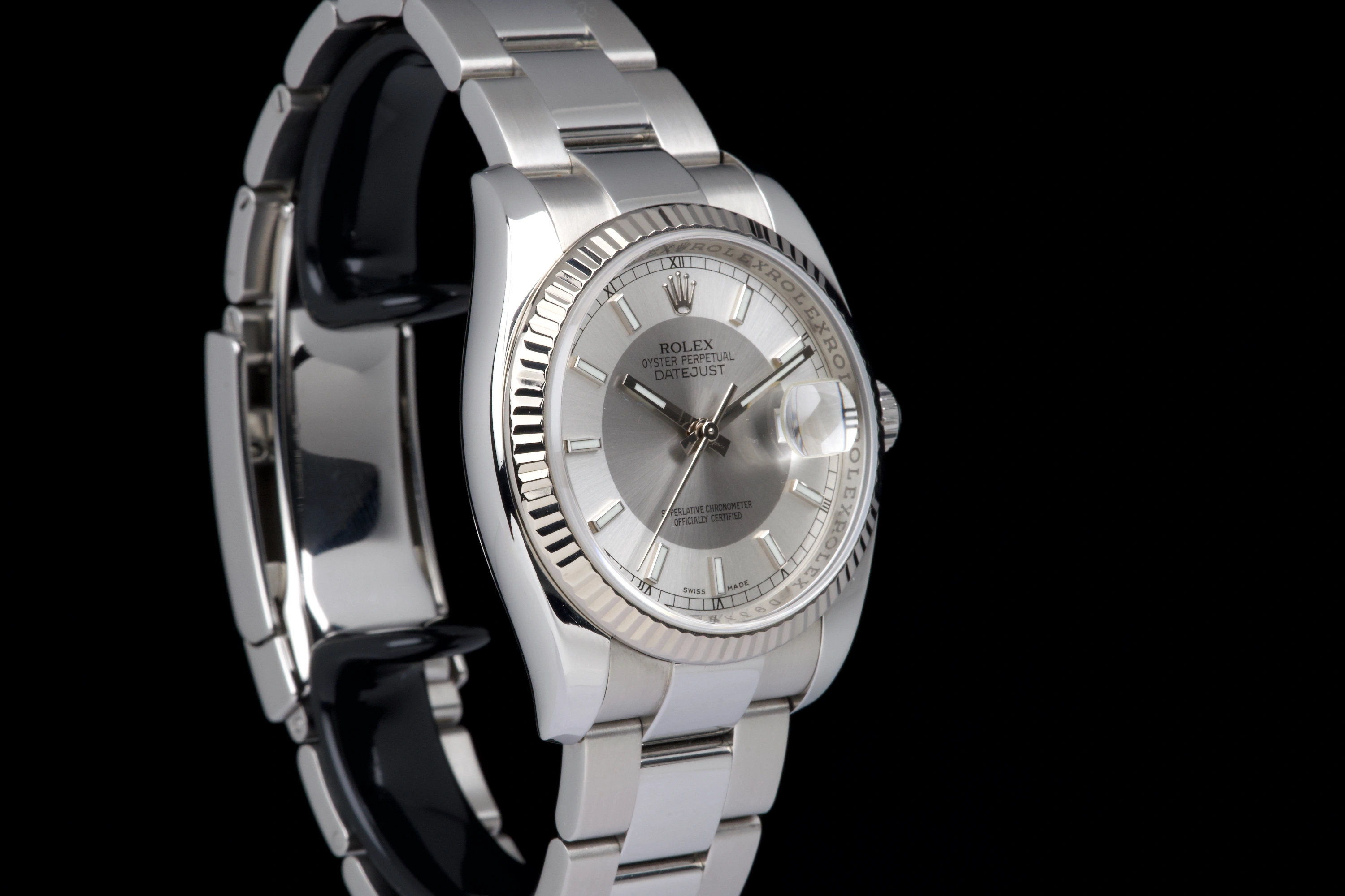 Rolex Datejust 36mm 116234 Box/Card 2007 D Serial, featuring a rare and elegant silver “Tuxedo” dial with matching Luminova hands.