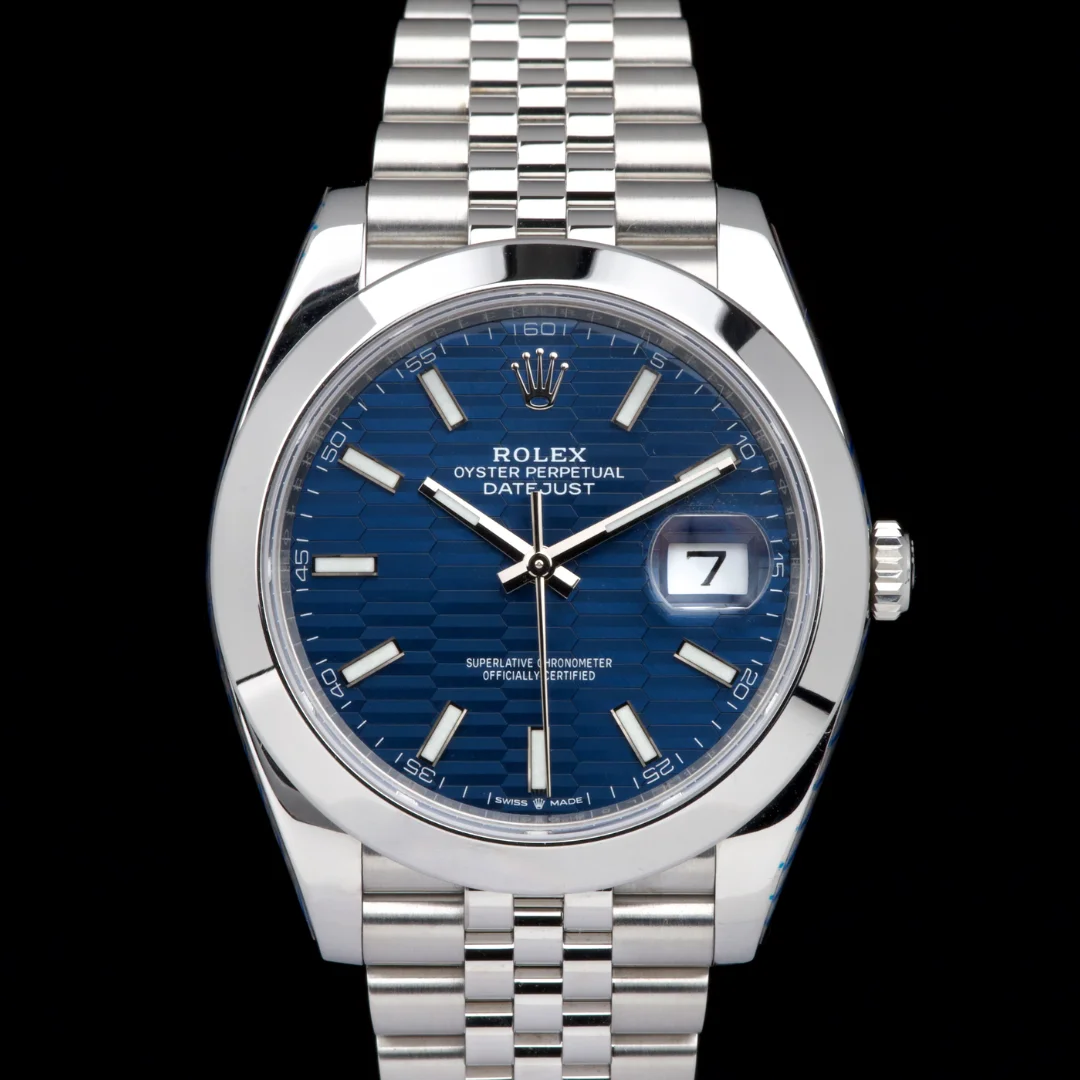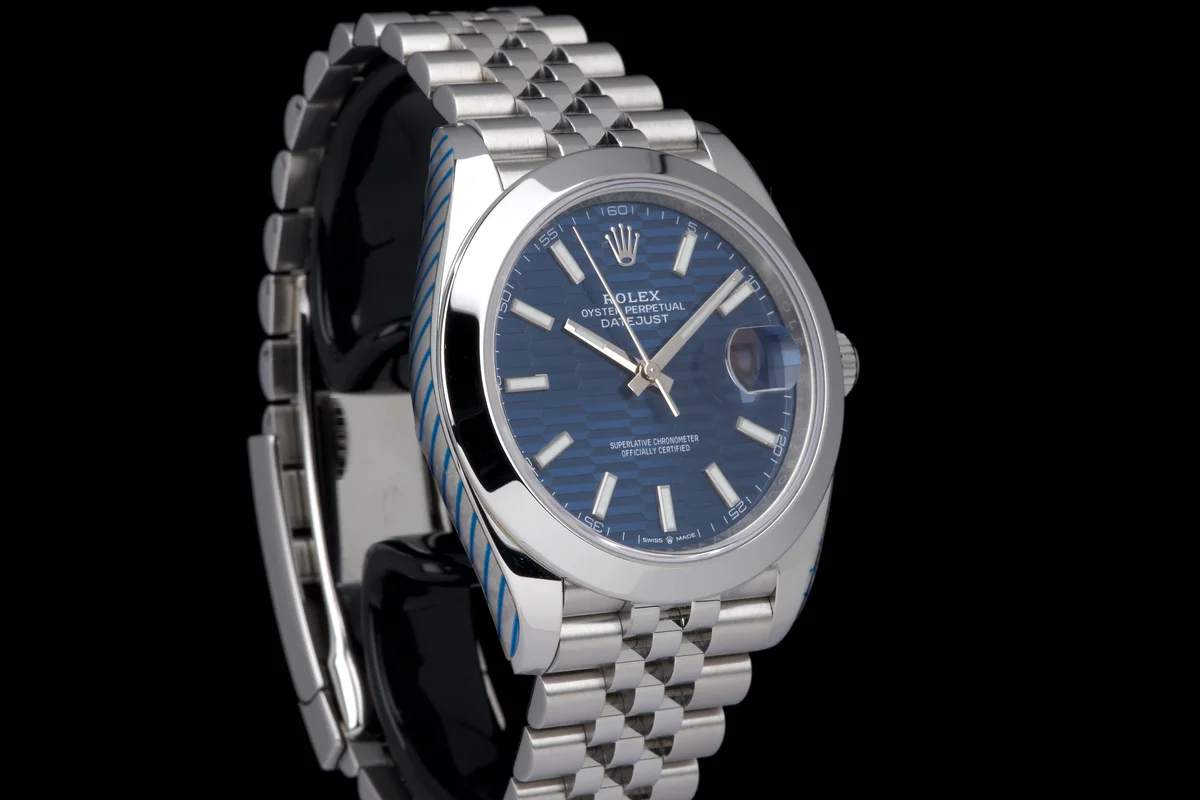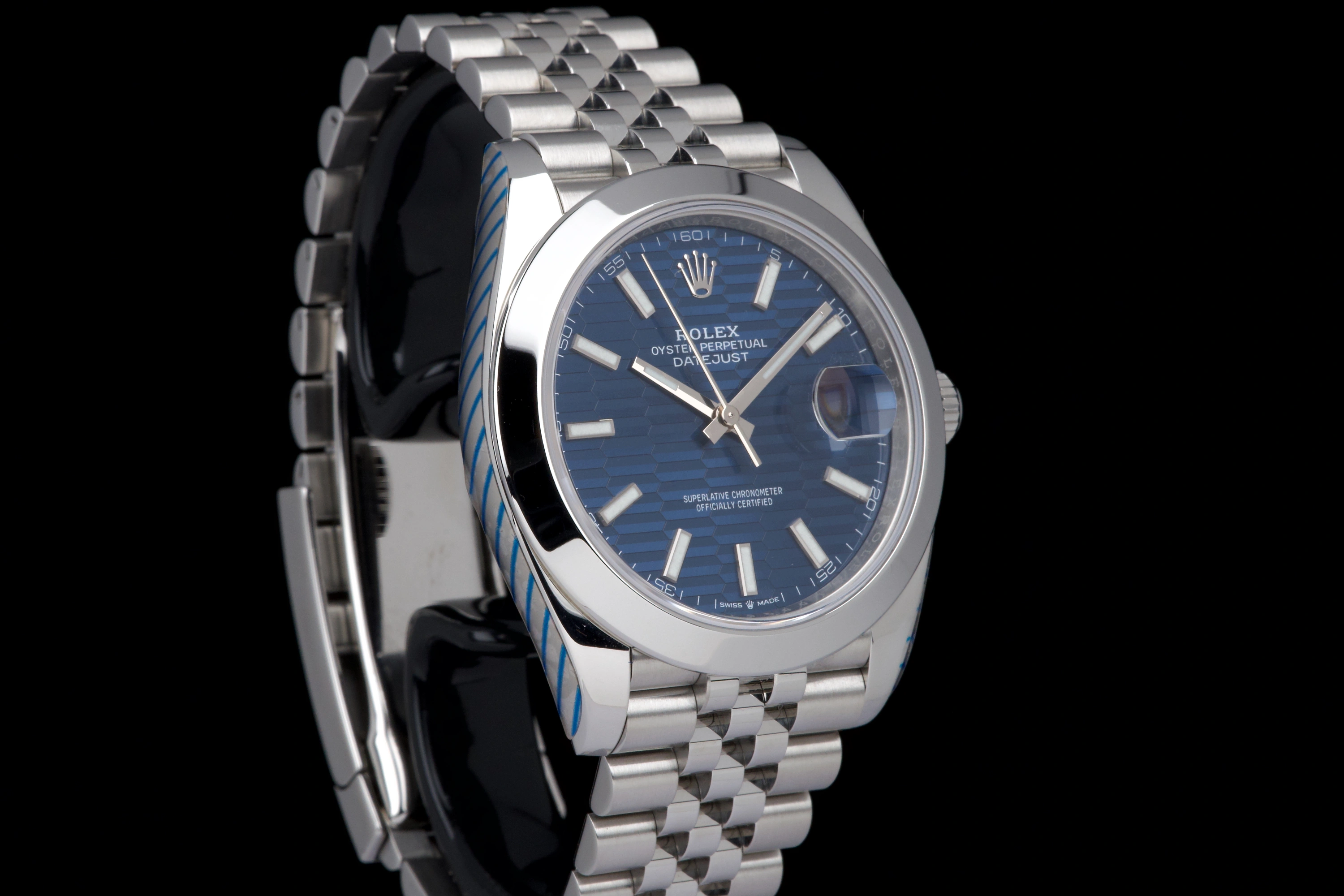 Rolex Datejust 41 reference 126300, Full Set 2022. This example is fitted with the highly sought-after blue fluted-motif dial on the jubilee bracelet