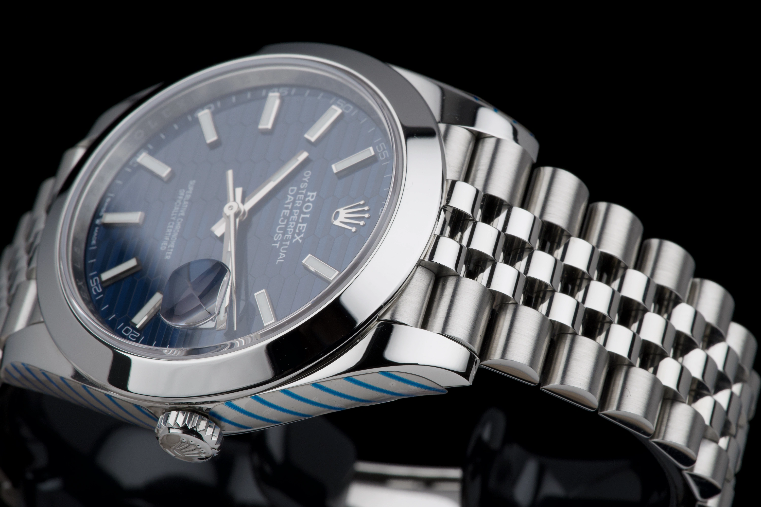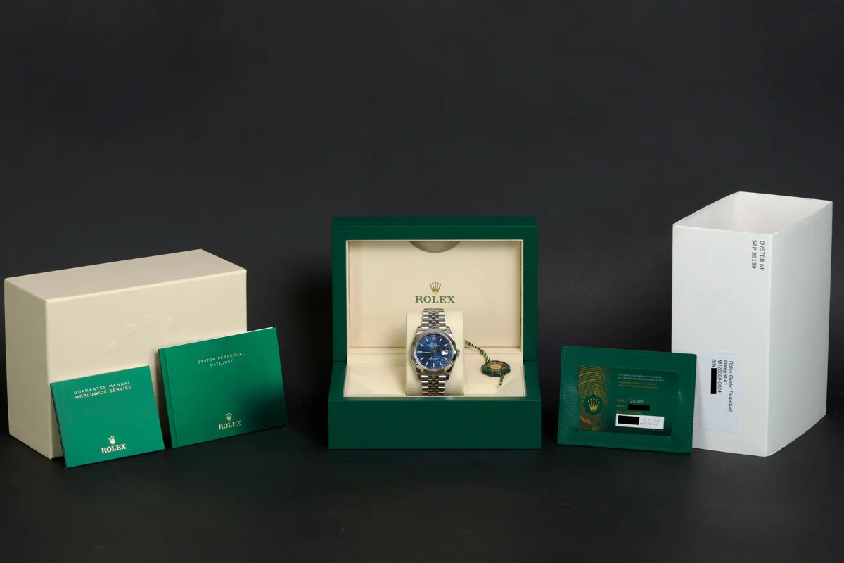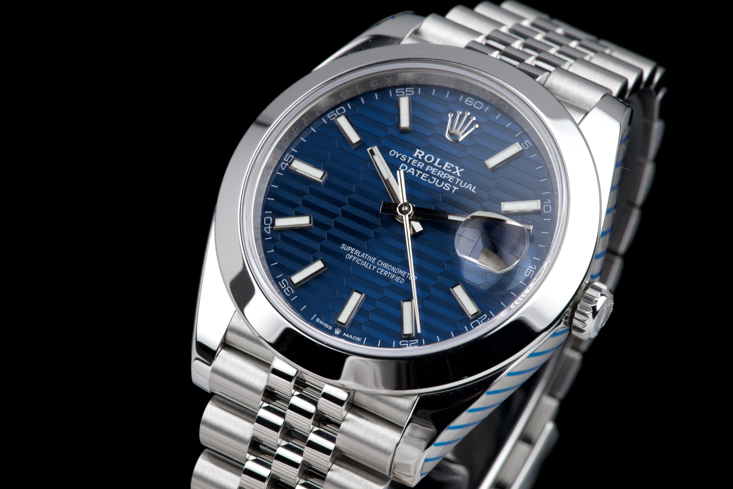 Rolex Datejust 41 reference 126300, Full Set 2022. This example is fitted with the highly sought-after blue fluted-motif dial on the jubilee bracelet