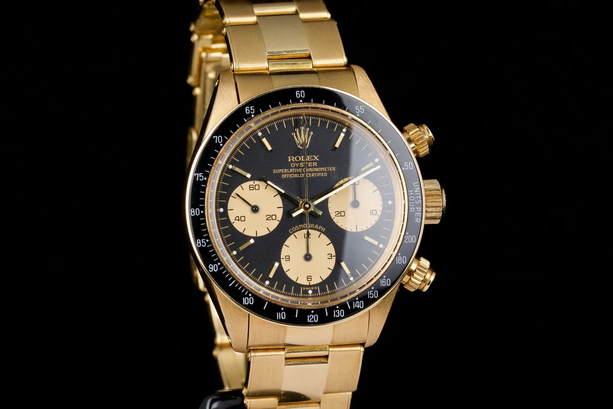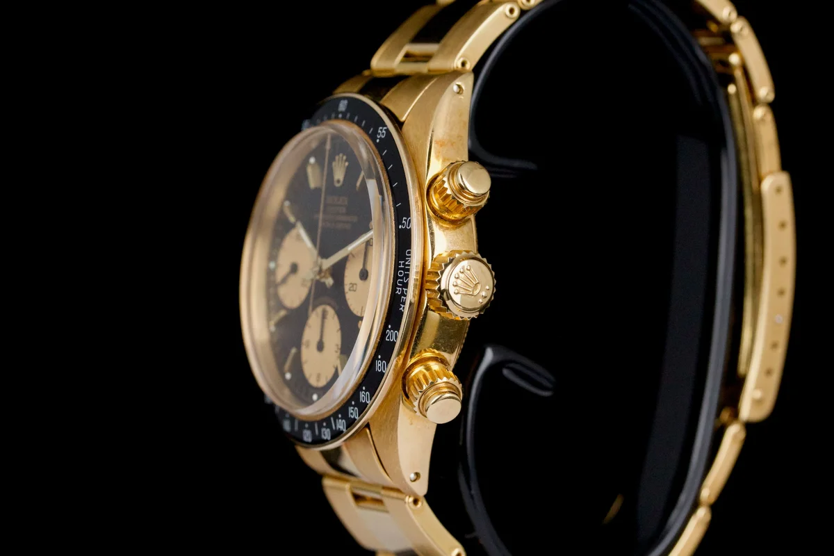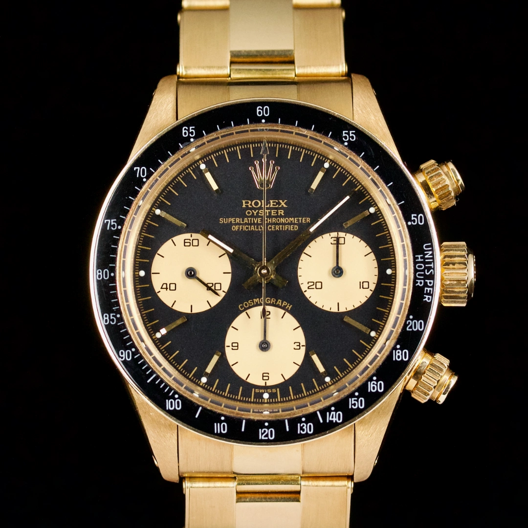 An icon among vintage chronographs, the Rolex Daytona 6263/8 in yellow gold blends sportiness with elegance in one of the most sought-after configurations of the manual-wind era.
