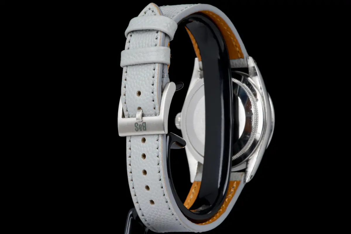The watch is presented on a grained leather strap (non-Rolex); no steel bracelet accompanies the watch.