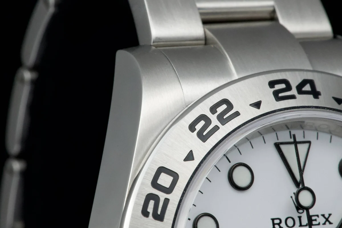 A pristine Rolex Explorer II Ref. 216570 with white dial, sold in 2021 and offered as a Full Set with original box and papers.