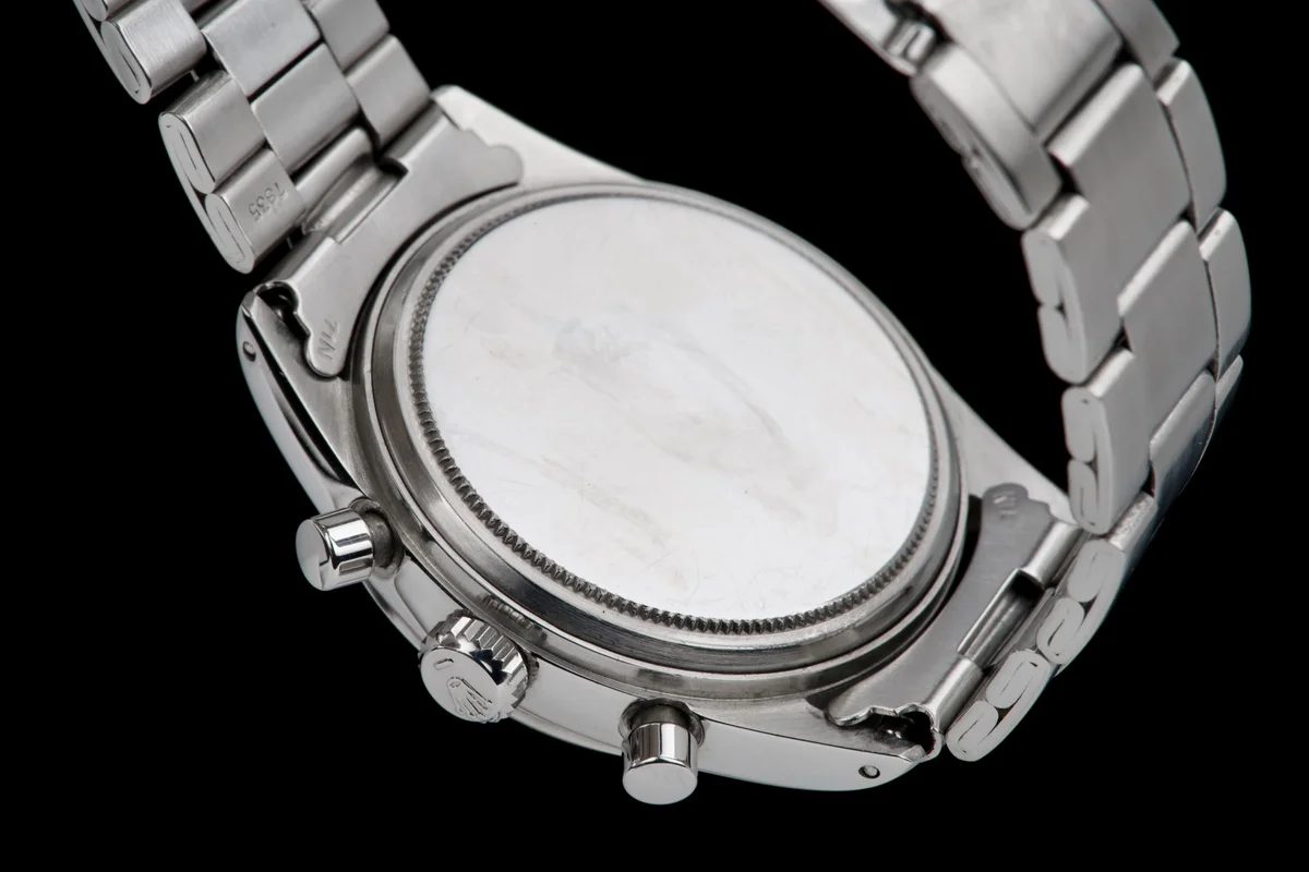 It features the “ROW” engraving, indicating it was originally delivered to the U.S. market. The caseback is correctly stamped 6238 and bears two Rolex Paris service engravings from 1996 and 2000.
