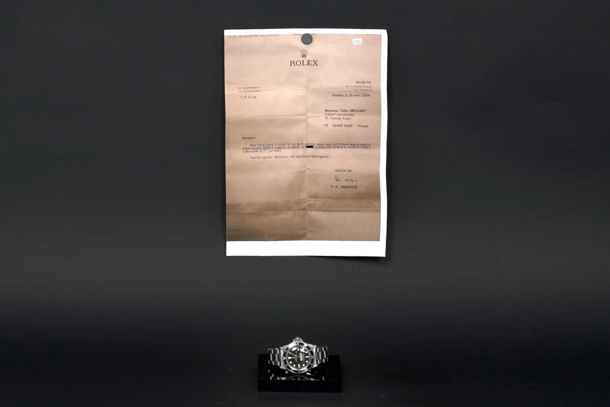 The watch is accompanied by a copy of the original Rolex letter confirming COMEX delivery to Marseille in 1982, strengthening its provenance and historical relevance.