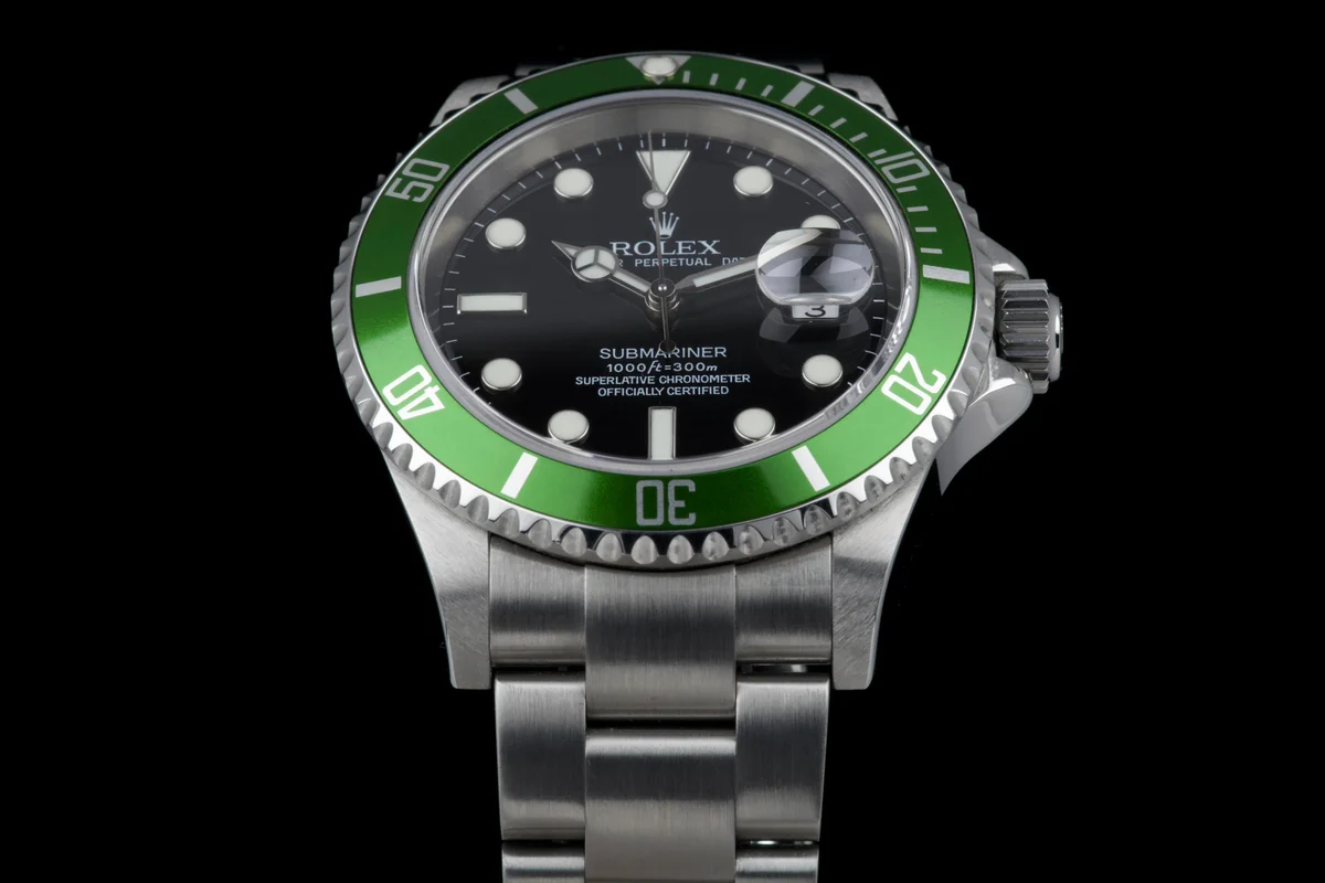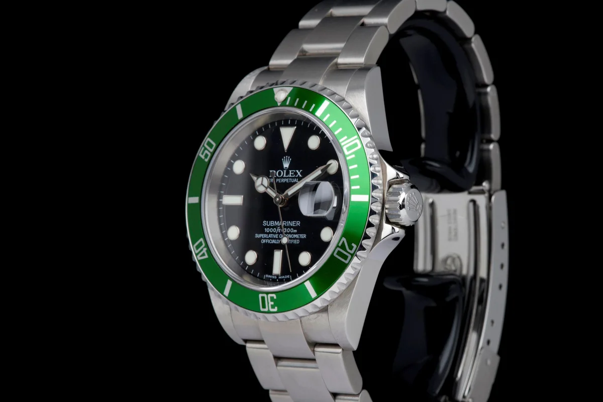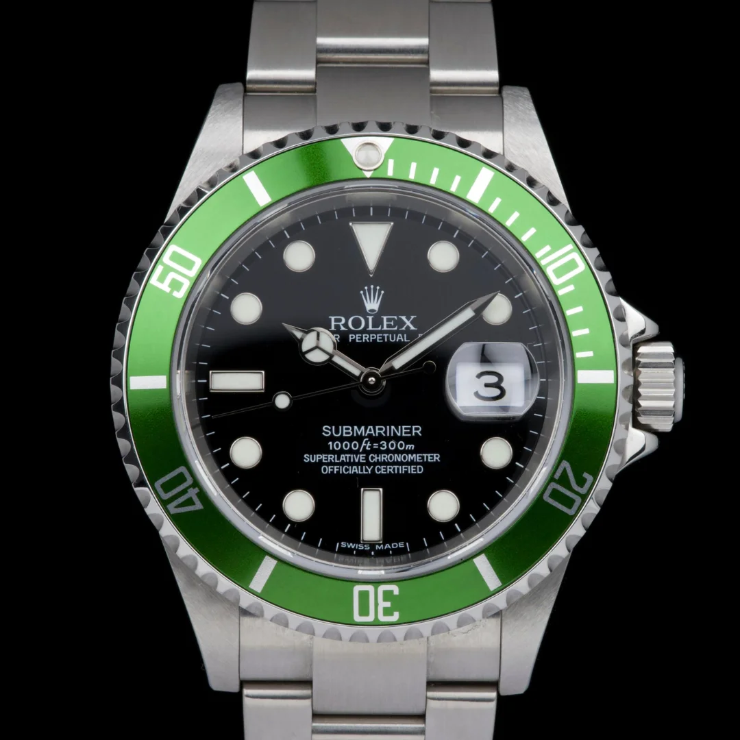 Presented here is an iconic and highly sought-after modern classic: the Rolex Submariner Date reference 16610LV, widely known as the “Anniversary” or “Kermit.”