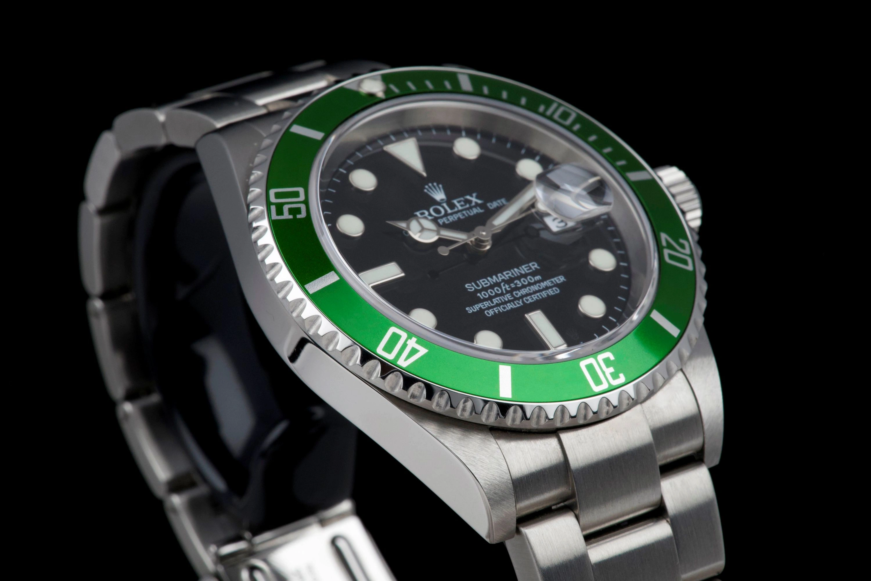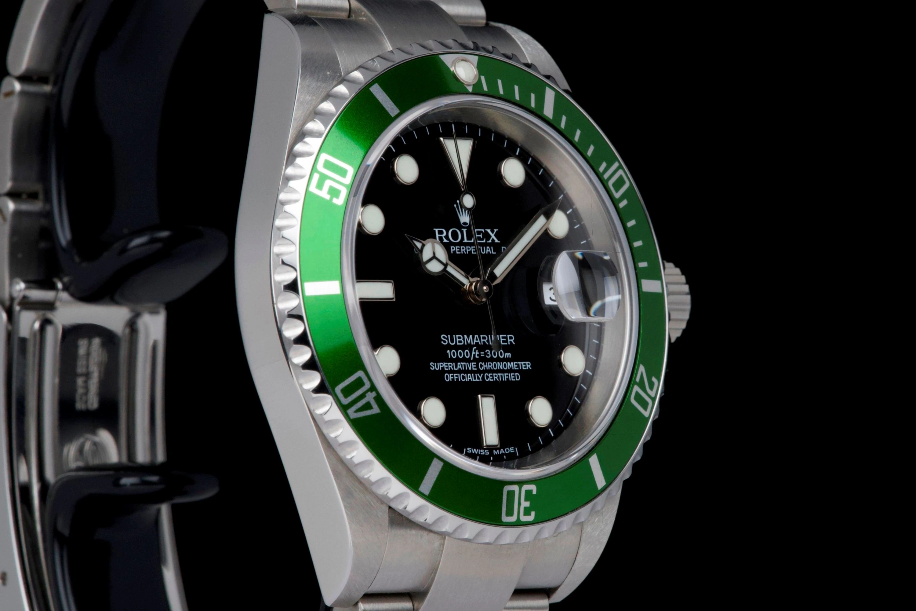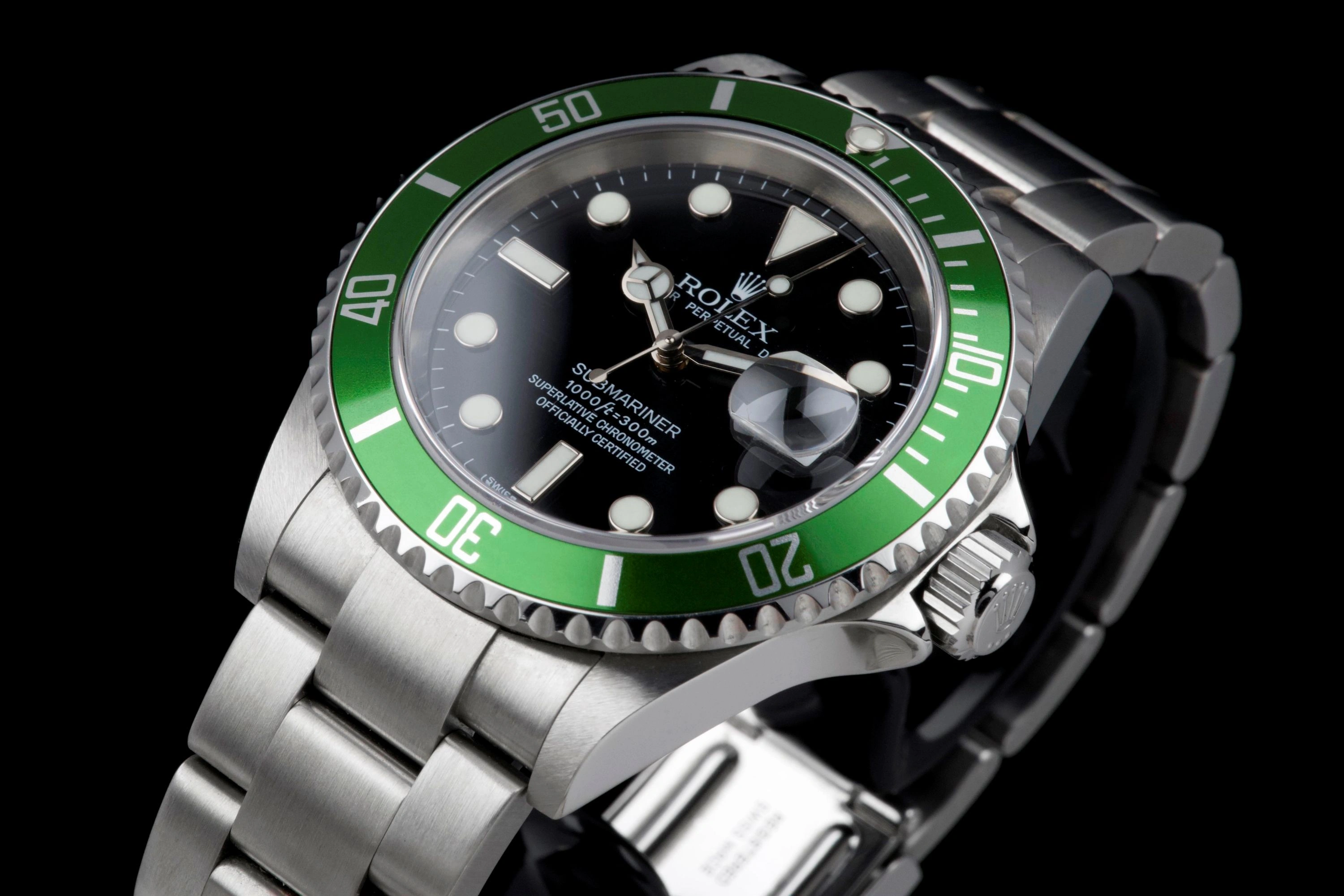Presented here is an iconic and highly sought-after modern classic: the Rolex Submariner Date reference 16610LV, widely known as the “Anniversary” or “Kermit.”
