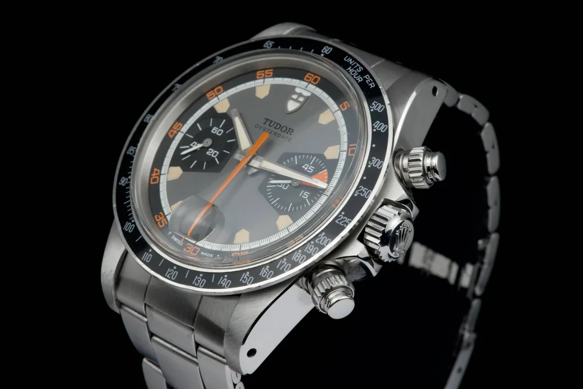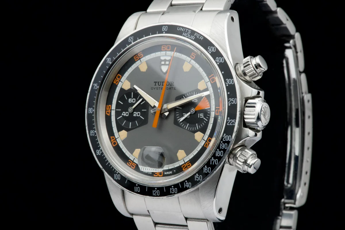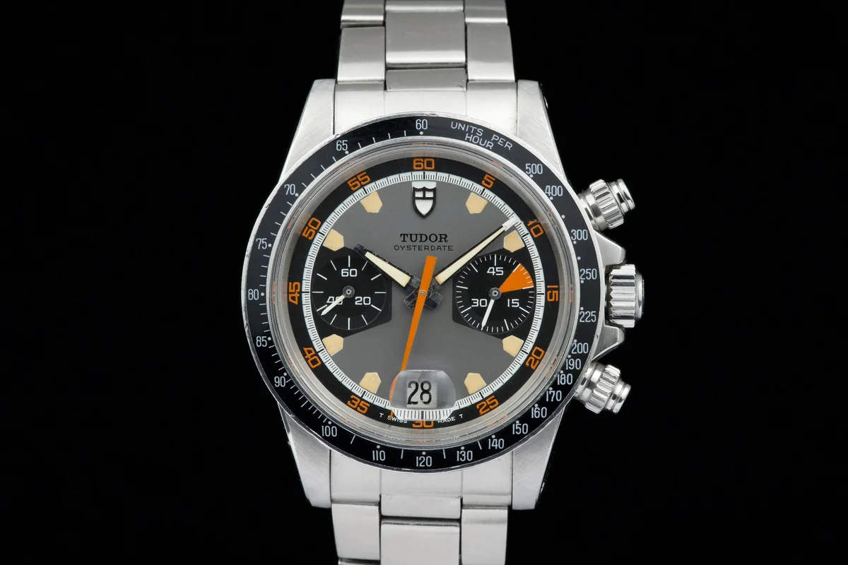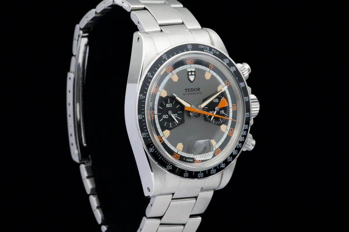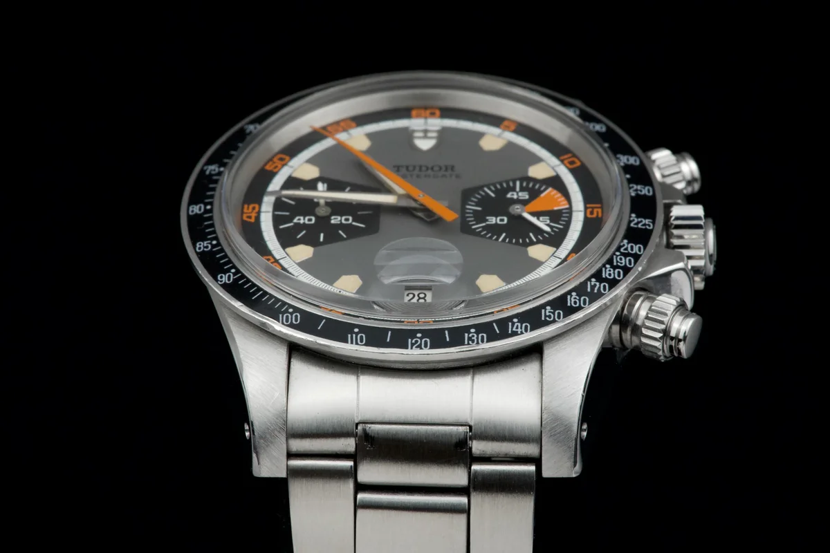 The Tudor Chronograph Oysterdate reference 7031 is the first of this model and will maintain the 39mm case diameter. The Chronographe 7031 uses a Valjoux 7734 mechanical caliber with manual winding and, visually, the angular lines predominate. The main feature of this Tudor Chronograph 7031 is that the bezel is a plexiglass disk with a tachymeter scale that reaches 500 units. Its dial has three colors: gray background, black counters and white minute track, while the most appreciated by collectors are its pentagon-shaped indexes which would give it the nickname of "Home plate", like the first base of baseball.