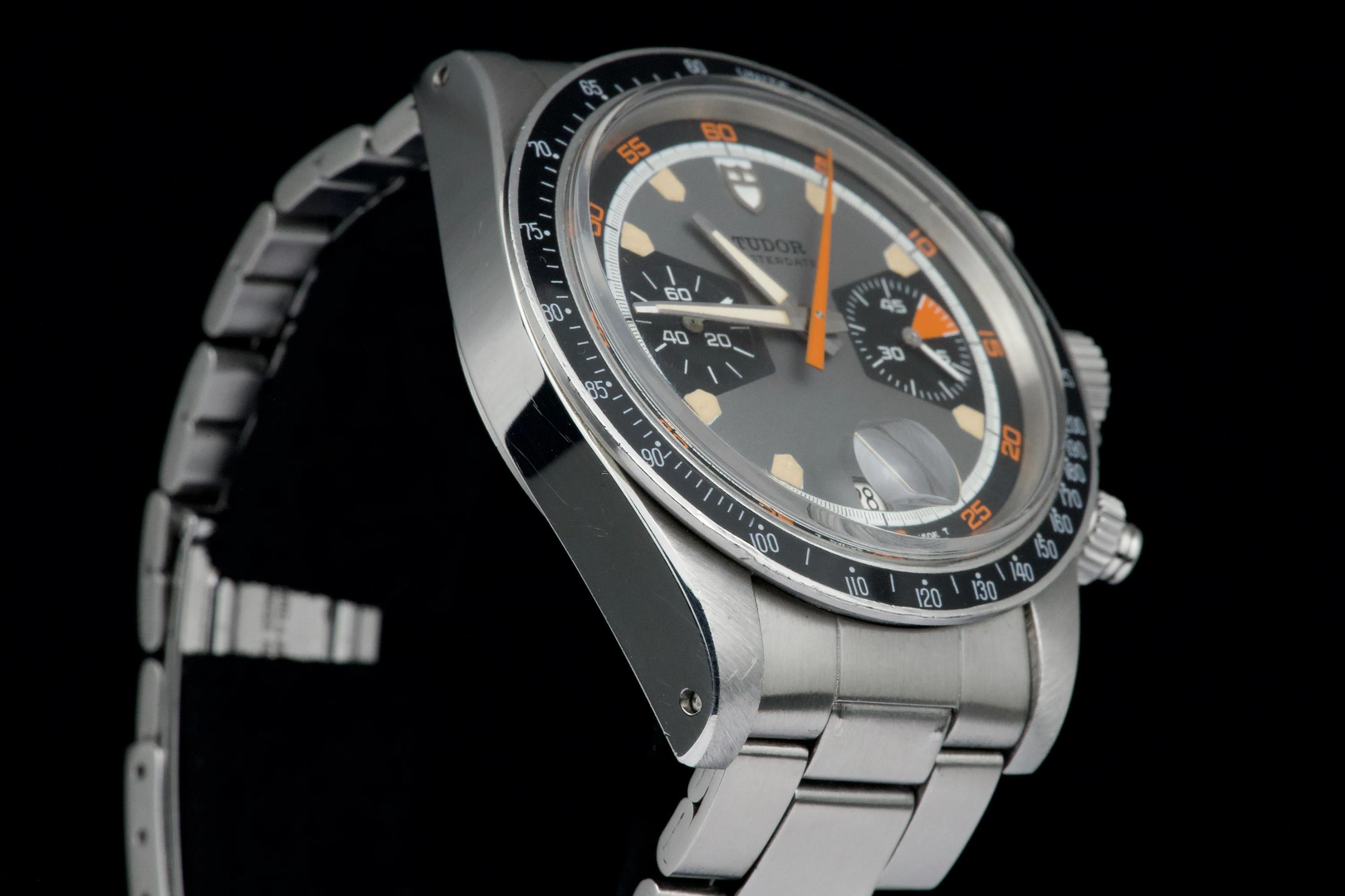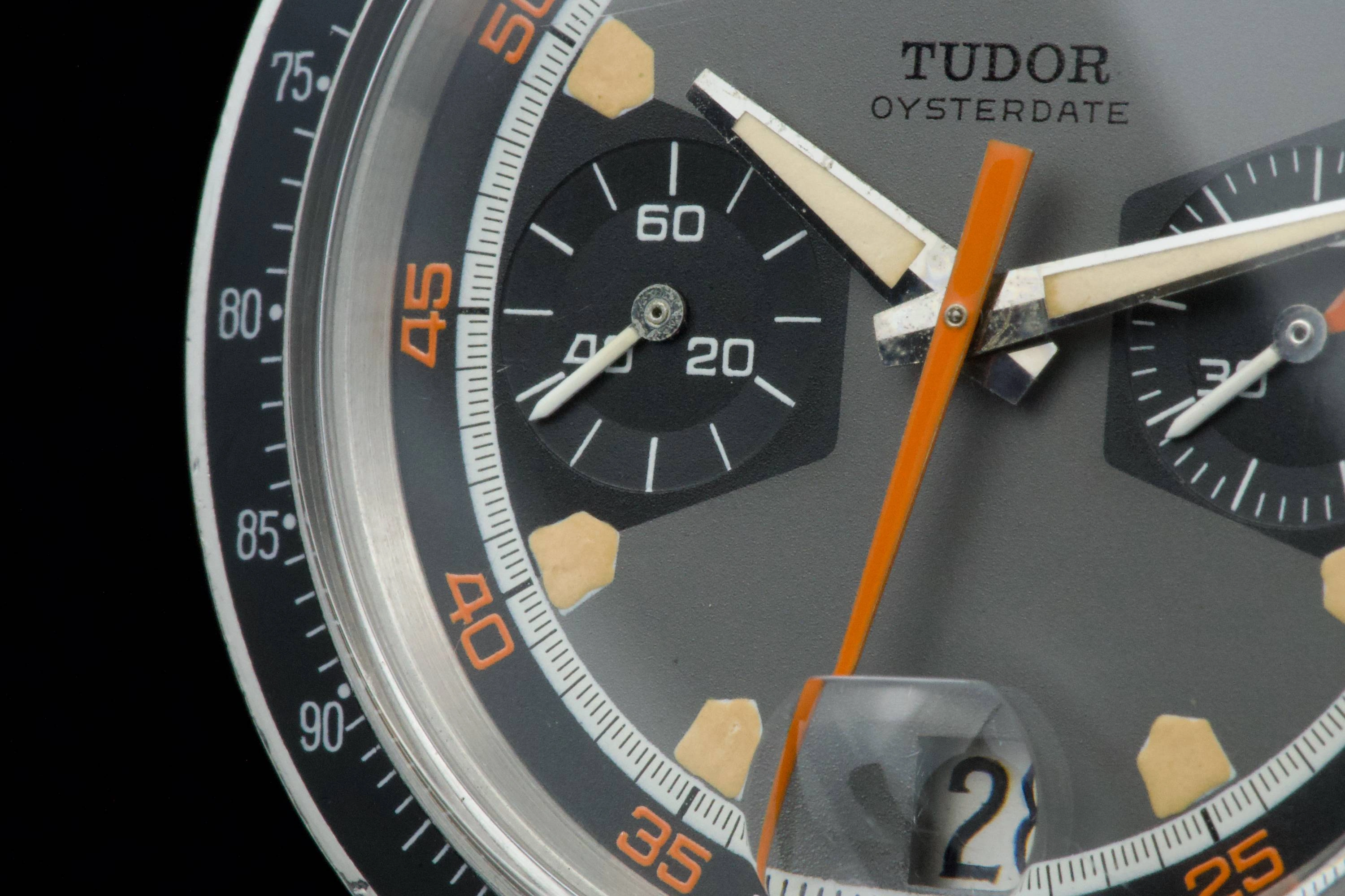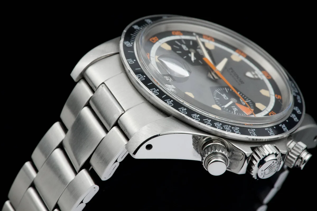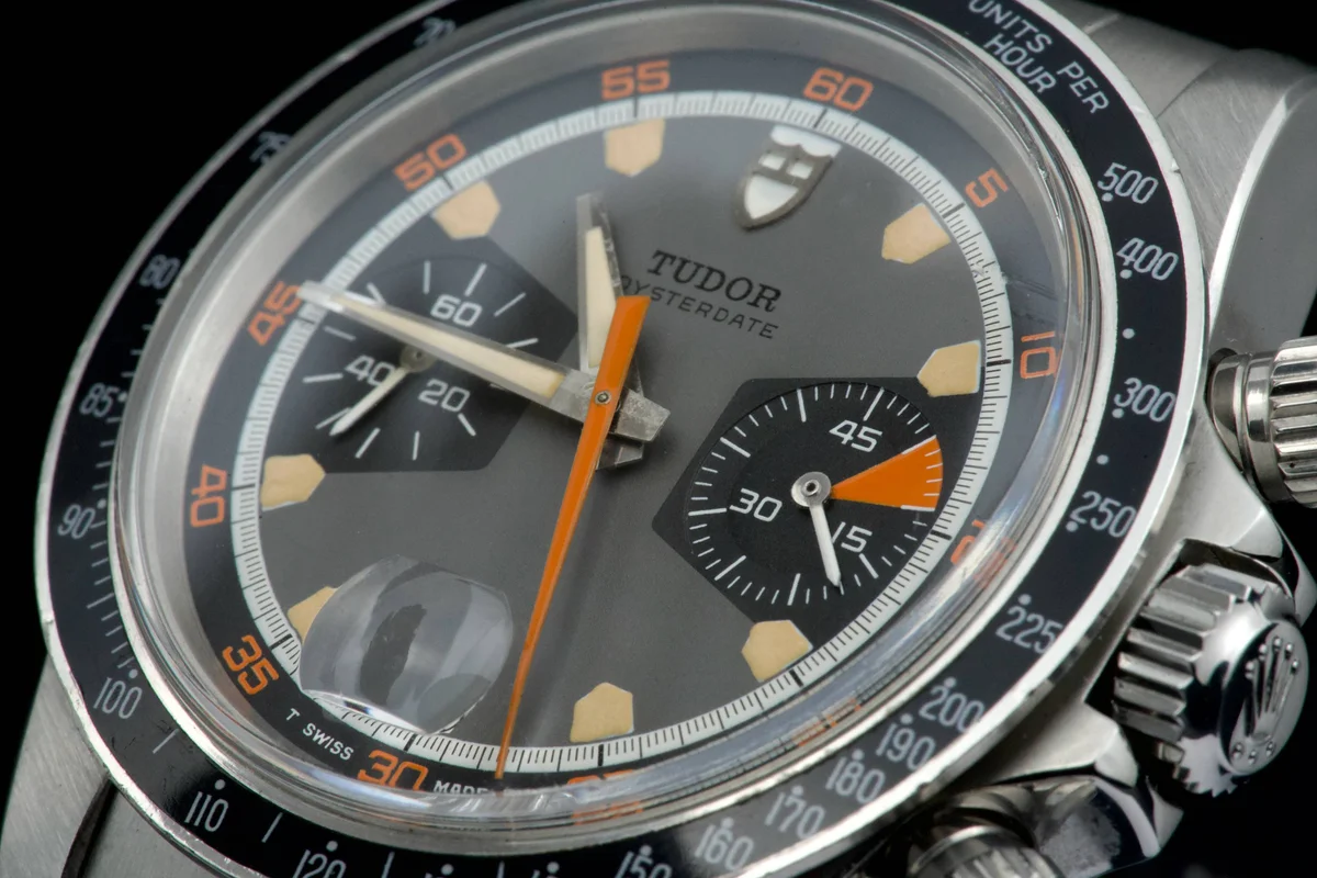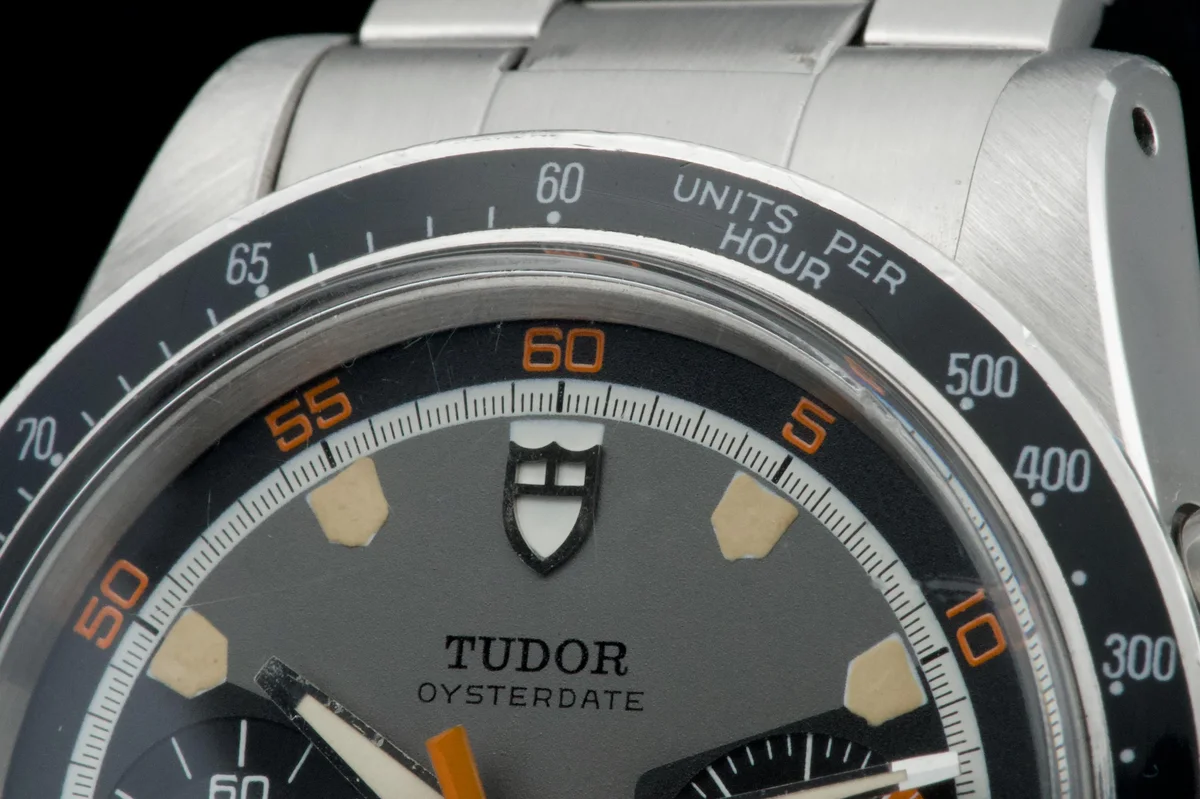 The Tudor Chronograph Oysterdate reference 7031 is the first of this model and will maintain the 39mm case diameter. The Chronographe 7031 uses a Valjoux 7734 mechanical caliber with manual winding and, visually, the angular lines predominate. The main feature of this Tudor Chronograph 7031 is that the bezel is a plexiglass disk with a tachymeter scale that reaches 500 units. Its dial has three colors: gray background, black counters and white minute track, while the most appreciated by collectors are its pentagon-shaped indexes which would give it the nickname of "Home plate", like the first base of baseball.