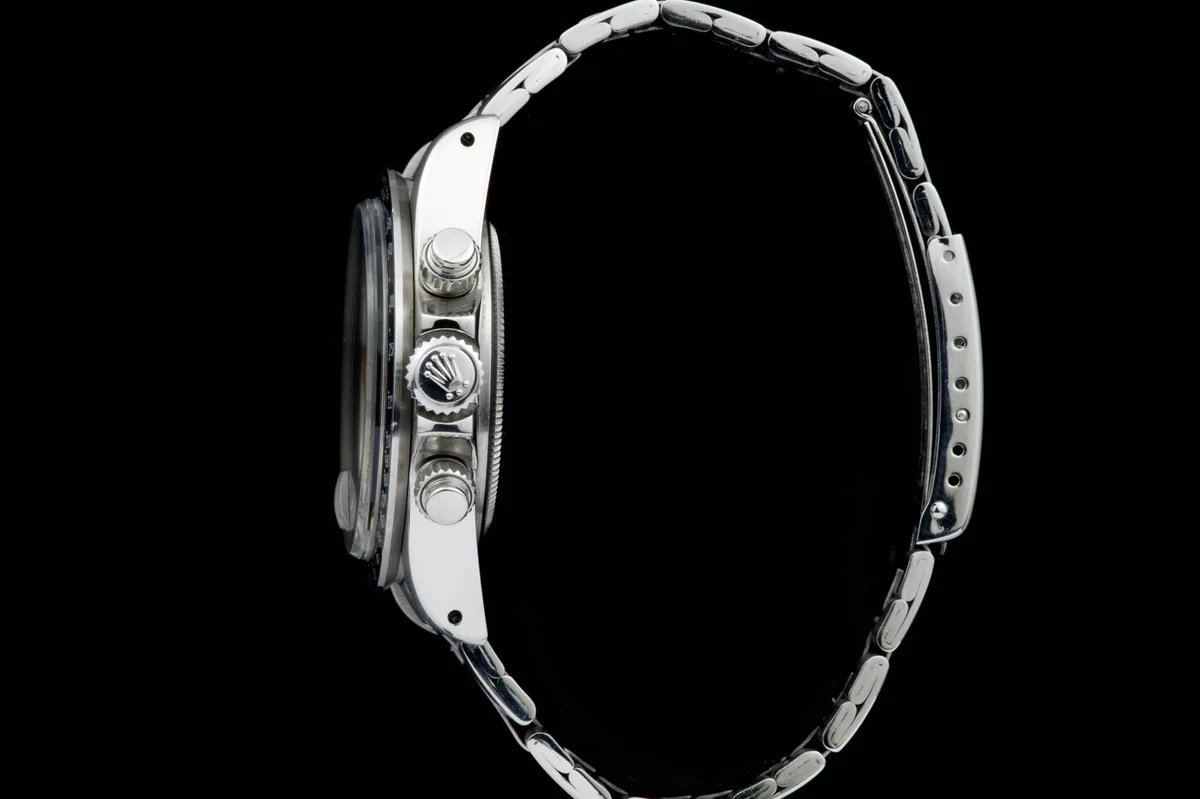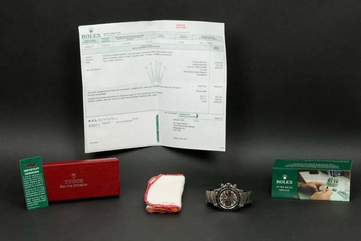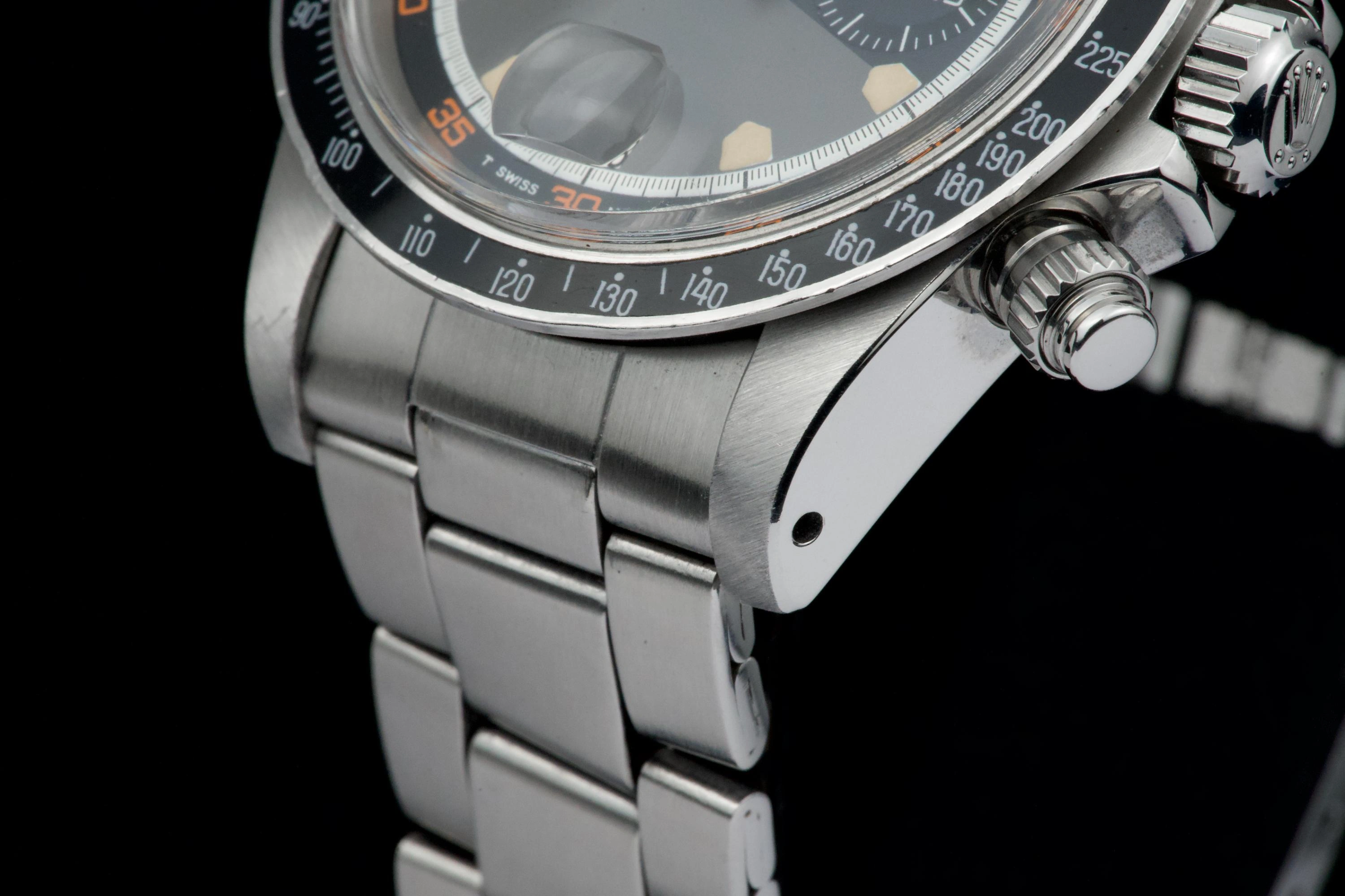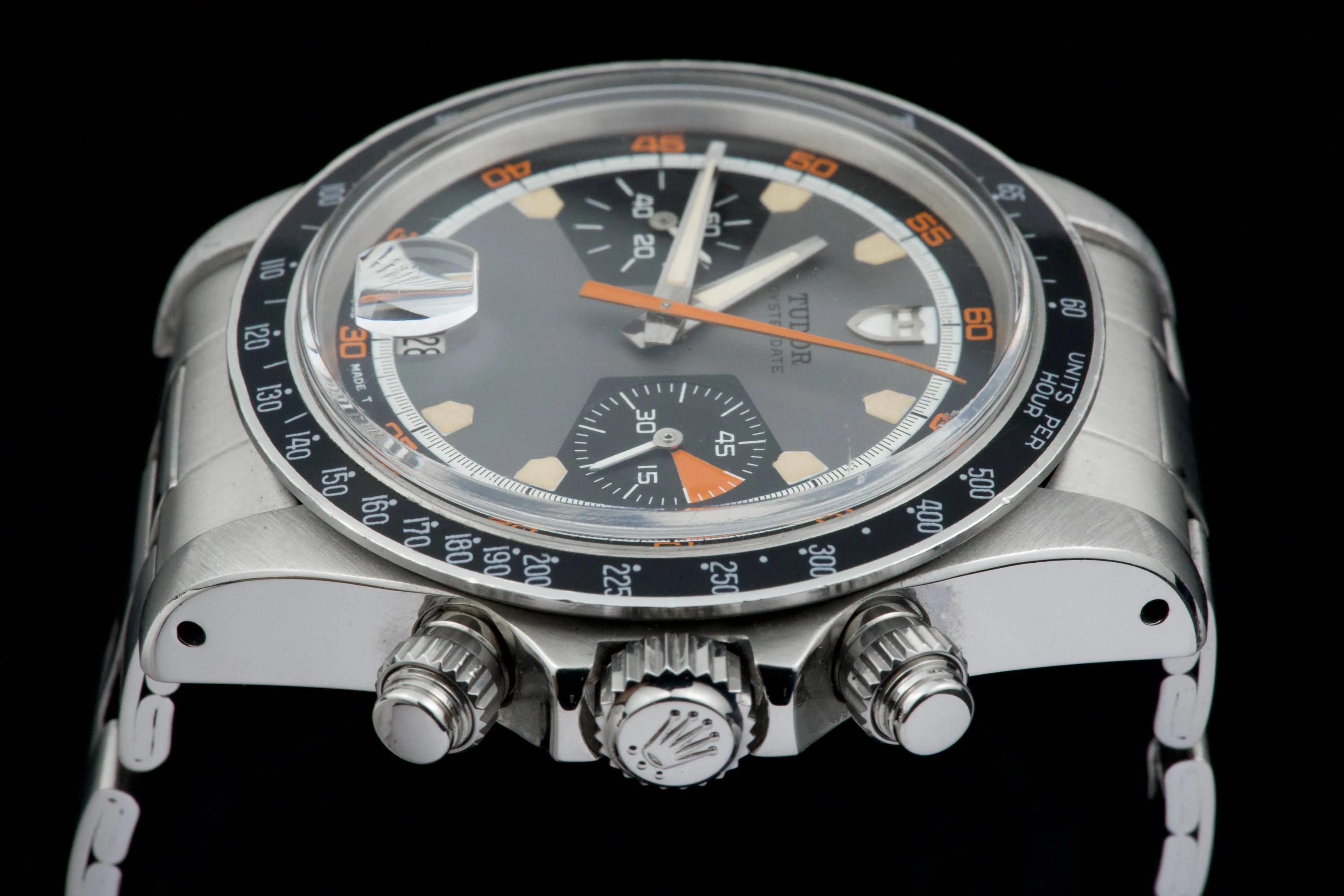 The Tudor Chronograph Oysterdate reference 7031 is the first of this model and will maintain the 39mm case diameter. The Chronographe 7031 uses a Valjoux 7734 mechanical caliber with manual winding and, visually, the angular lines predominate. The main feature of this Tudor Chronograph 7031 is that the bezel is a plexiglass disk with a tachymeter scale that reaches 500 units. Its dial has three colors: gray background, black counters and white minute track, while the most appreciated by collectors are its pentagon-shaped indexes which would give it the nickname of "Home plate", like the first base of baseball.