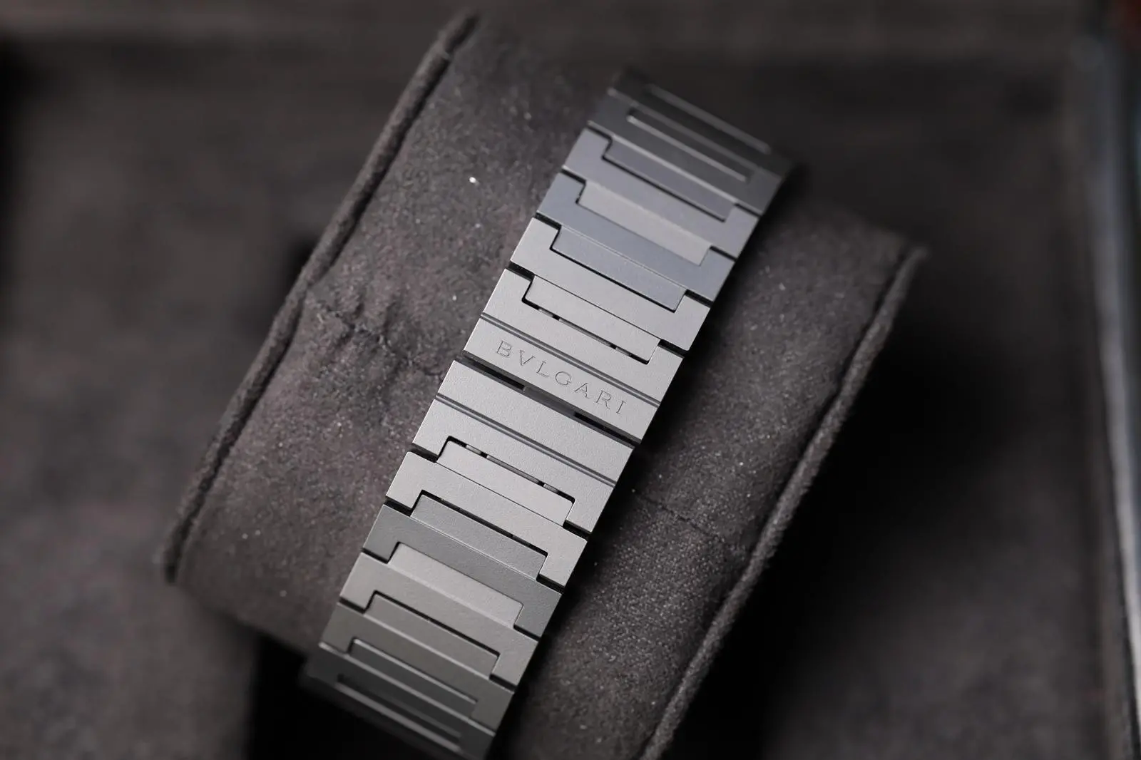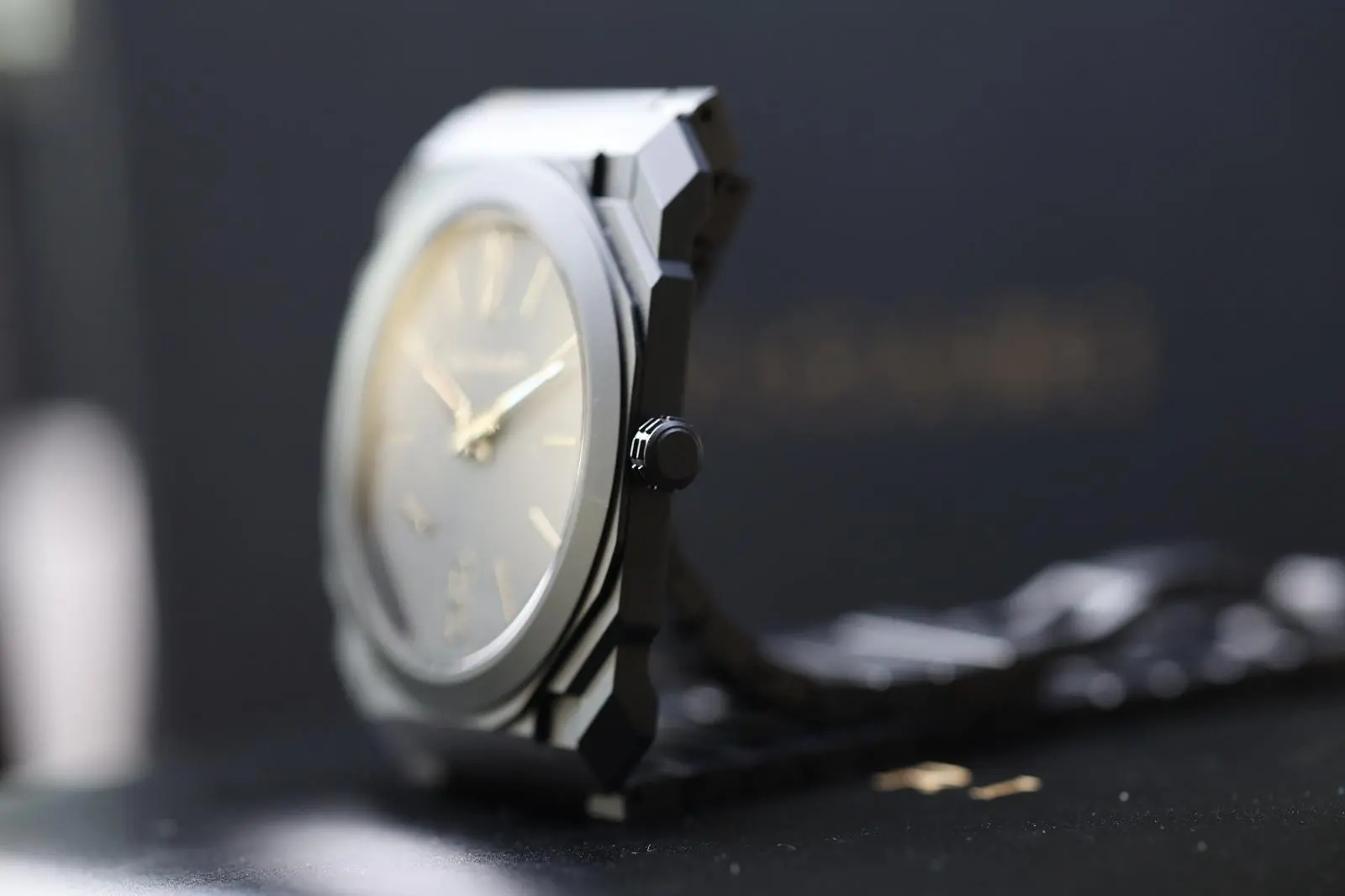Introduced in 2019, the Bulgari Octo Finissimo Automatic Ref. 103077 features a black ceramic case, a black ceramic bracelet, and a black ceramic dial. Octo Finissimo Automatic Uhr aus schwarzer sandgestrahlter Keramik mit extraflachem mechanischen Manufakturwerk, Automatikaufzug mit Mikrorotor aus Platin, kleiner Sekunde und transparentem Gehäuseboden. Wasserdicht bis 30 Meter