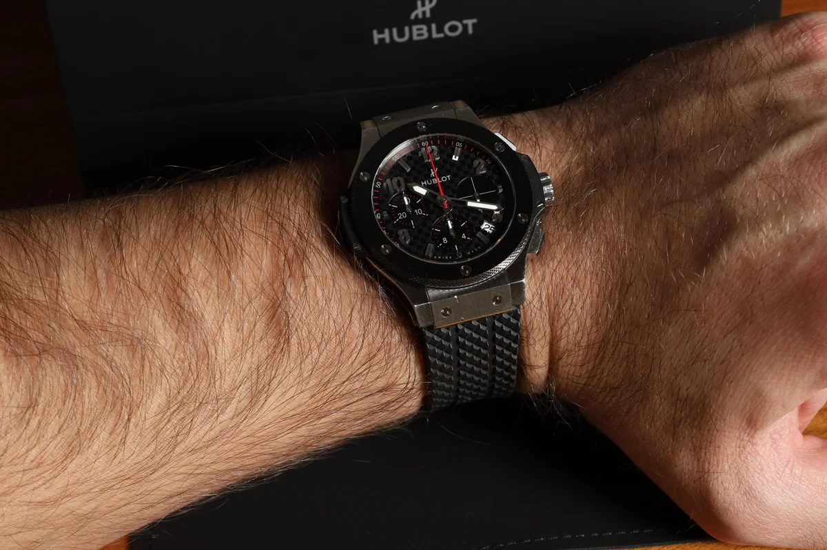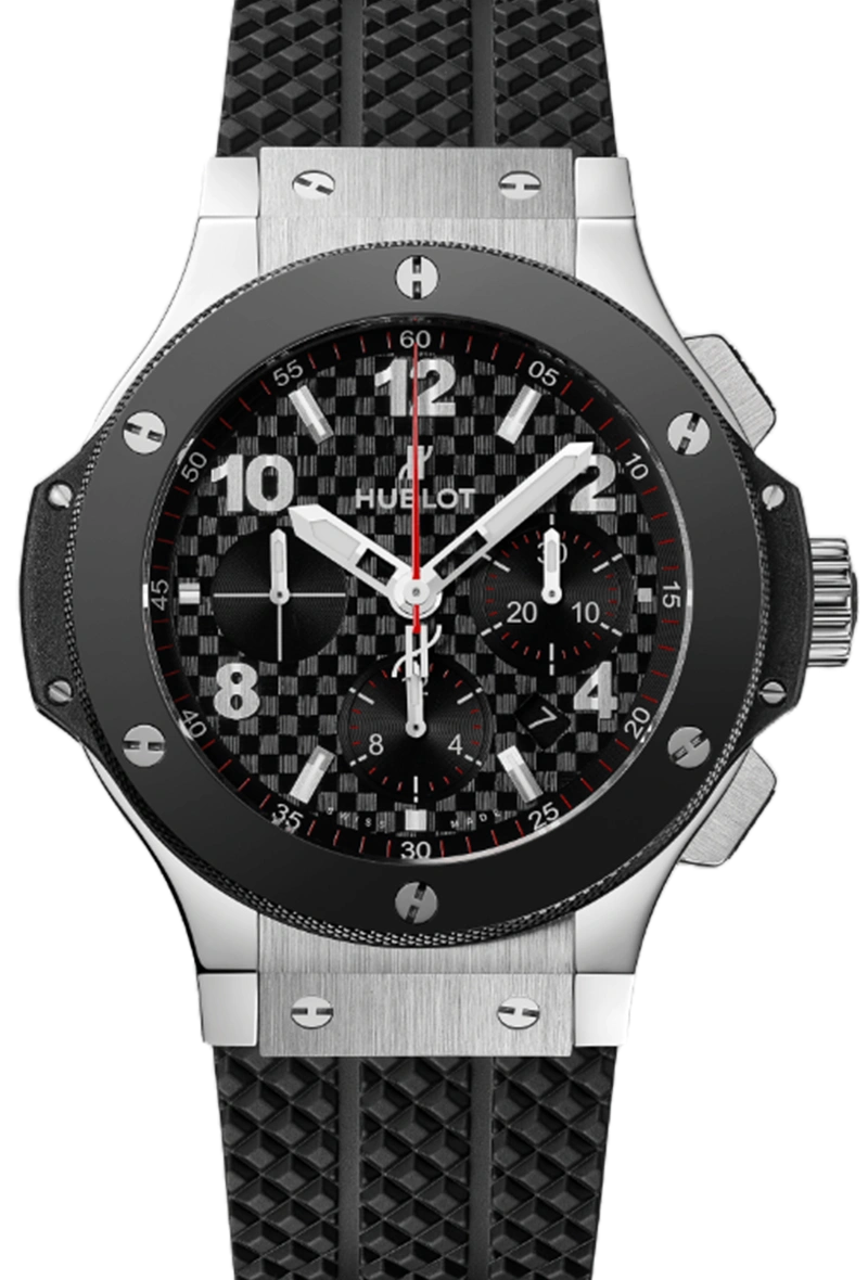 The Hublot Big Bang Original 41 341.SB.131.RX has a stainless steel and ceramic case of 41.00mm and a Black dial. This watch is powered by caliber HUB4300, a self-winding movement with chronograph and date.