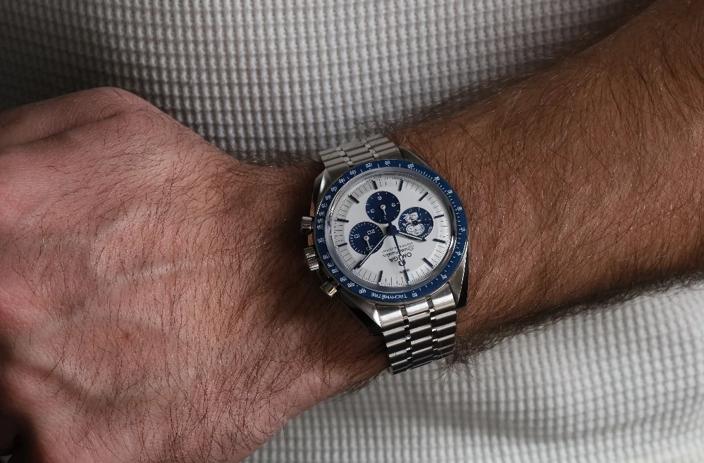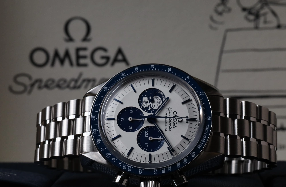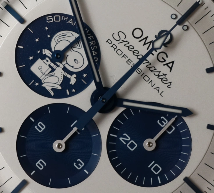The Omega Speedmaster Professional Apollo 13 50th Anniversary Silver Snoopy Award reference 310.32.42.50.02.001 was introduced in 2020. This Speedmaster Snoopy has a stainless steel case with a ceramic bezel insert, and a silver dial with blue sub dials. It is fitted with a blue fabric strap. Inside ticks Omega's caliber 3861 hand-wound chronograph movement. The case back has Snoopy's rocket moving when the chronograph is engaged, whilst the earth rotates in sync with the smalls seconds hand.